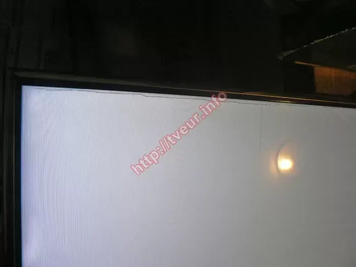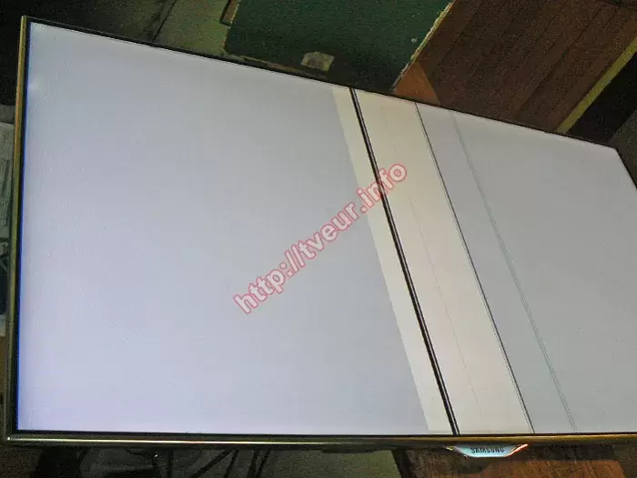 Поступил 40-дюймовый 3D телевизор с LED подсветкой - Samsung UE40ES8007U с достаточно серьезной проблемой, у него появились вертикальные полосы на матрице, которая белого цвета. На приемке пользователь сообщил, что данная проблема начала себя проявлять после того, как экран помыли водой, которая предположительно могла затечь во внутрь. Судя из многолетней практики потребуется сложный и дорогостоящий ремонт залитой матрицы, выполнить который без наличия специального оборудования не возможно. Данная модель, которая собрана в 2012 году и поддерживает функцию Smart TV доставлена в сервисный центр в обрешетке и обернута картоном. Такая неисправность, как в данном случае является результатом неправильной эксплуатации современного телевизора с хрупкой тонкой матрицей. Когда ее по неосторожности или по незнанию заливают водой, это приводит к тому, что ремонт окажется достаточно дорогим. Осмотрев телевизор стало понятно, что посередине экрана вертикальные полосы, самая широкая из них белого цвета, на которой отчетливо видны несколько черных полос разной ширины. Чуть правее также есть полосы, но более прозрачные (фото № 1). Проблема осложнена тем, что вдоль верхней рамки имеется длинная и глубокая царапина, приблизительно 30-35 см (см. фото № 2 и 3), при этом телемастер сделал заключение, что при разборке телевизора она мешать не будет. Разобрав устройство и выполнив диагностику стало понятно, что ремонт залитой матрицы должен состоять в восстановлении шлейфа матрицы. Но данные действия не смогли полностью решить проблему, поскольку экран так и остался белого цвета, хотя полосы пропали. В данной ситуации пришлось заказать и выполнить замену новой платы T-con BN41-01790C. На ремонт и новую деталь выдана гарантия. Рекомендуем более аккуратнее обращаться с телевизором!
