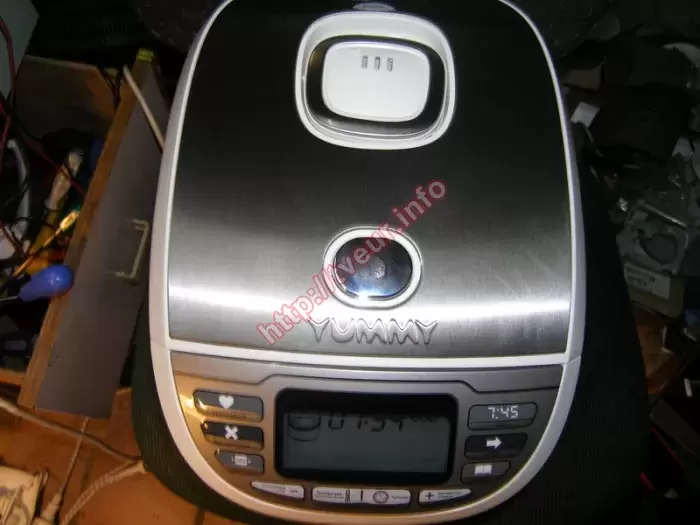 Мультиварка YUMMY YMC-505WX, в которой используется плата управления RHFB-3z01(RH-808YJ-3) через минуту работы переходит в режим подогрева. По этой причине она поступила в нашу сервисную мастерскую, где ремонт мультиварок выполняется не зависимо от сложности поломки. Данная модель наделена такими востребованными функциями, как 3D нагрев, фритюрница, поддержание температуры, таймер отсрочки. Мощность этой кухонной бытовой техники 1000 Вт, она имеет 22 автоматические программы, с помощью которых можно приготовить большое количество разных блюд. После предварительного осмотра мультиварки стало понятно, что она практически новая, внутри и снаружи чистая, дисковый нагреватель не прогоревший, без потеков. При этом начали образовываться сухие пайки. Кроме того, из строя вышла плата питания, она и спровоцировала возникновение неисправности, что является достаточно распространенной причиной. Чтобы выполнить ремонт мультиварок с такой проблемой, устройство пришлось полностью разбирать (видно на фото №3). В результате была восстановлена работоспособность платы питания. Для этого пришлось перепаять некоторые детали. После ремонта эта современная мультиварка работает во всех режимах хорошо. При дальнейшей эксплуатации и впредь стараться, чтобы на дисковый нагреватель не попадала жидкость.