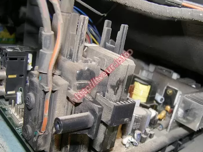 ЭЛТ-телевизор с плоским экраном Panasonic TC-21PM30R с диагональю 21-дюйм, форматом экрана 4:3 и поддержкой телевизионных форматов PAL, SECAM, NTSC. Он не включается, но лампочка мигает. С такой неисправностью нужна точная диагностика. Поскольку выяснилось, что проблема в модуле строчной развертки, ремонт телевизоров состоял в восстановлении монтажа этого модуля. Помимо этого необходимо было поменять много разных пассивных элементов, в том числе MD 1803DFI. Данная новая деталь была заказана и поменяна. После выполненного ремонта, телевизор работает нормально.