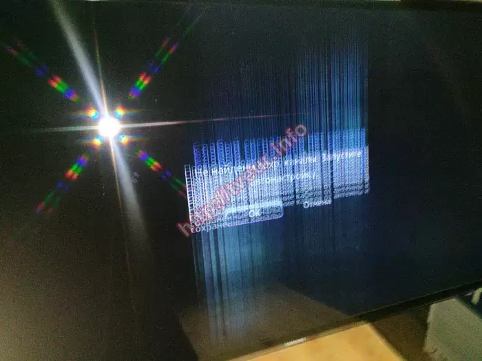 Дефект в телевизоре проявляется достаточно сильно. Посередине много вертикальных полос синего цвета, чем-то напоминающее сплошное пятно. Надписи на матрице повторяются по 5-6 раз. Чтобы ремонт матрицы телевизора был выполнен с положительным результатом, необходимо было правильно определить причину, по которой возникла такая неисправность. Телевизор полностью разобрали и провели диагностику, которая показала, что поломка сложная, так как из строя вышли планки матрицы. Именно по этой причине на экране возникает дрожание и двоение изображения.