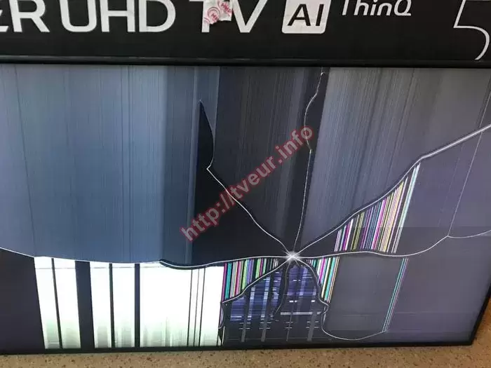 Когда телевизор осмотрели в сервисном центре, стало понятно, что замена экрана на телевизор неизбежна, из-за сильного удара она практически вся в механических повреждениях. Правее логотипа образовалась небольшого размера дырка, от нее глубокие трещины по всему экрану. Между ними вертикальные цветные полосы, которых очень много и которые разной длины. Вверху экран более светлый, здесь видны тонкие цветные полосы. Снизу также много дефектов, которые выражены в виде широких белых столбцов и пунктирных белых полосок вдоль нижней рамки. Когда телевизор включается, на нижней части матрицы меняется цвет. Выполненная диагностика показала, что остальные составляющие телевизора исправны, поэтому их ремонт не требуется.