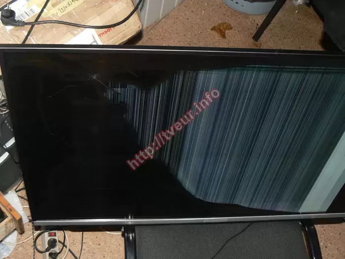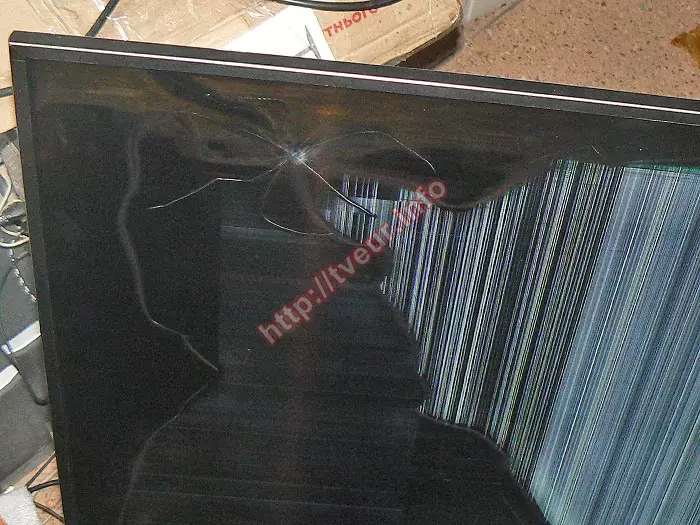 Первоначальный осмотр показал, что удар был в верхний левый угол, в результате чего появилась дырка небольшого размера. От нее небольшие трещины, которые напоминают цветок. Также на экране фиолетового и зеленого цвета разводы. Через всю матрицу видны длинные тонкие трещины, между которыми большого размера светлое пятно, на котором много вертикальных цветных полос разной ширины. Ближе к боковой правой рамке появился светлый широкий столбец, который переходит в светло голубой цвет. Остальная часть экрана темная, но здесь также просматриваются горизонтальные полосы разных цветов, которых много. На вопрос - сколько стоит диагностика телевизора, заказчику сразу же сообщили, что в случае выполнении ремонта она бесплатная.