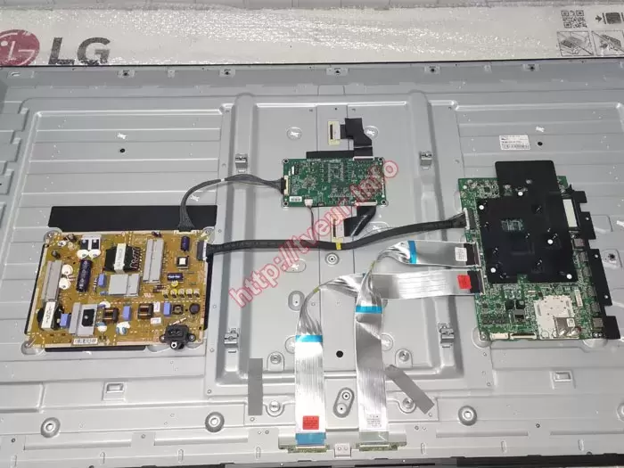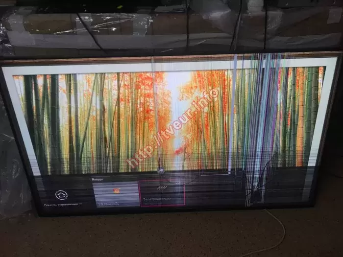 Мы можем поменять матрицу в телевизоре, не зависимо от диагонали, поэтому приняли его в работу. Выяснилось, что матрица действительно имеет серьезные повреждения, в месте удара, недалеко от нижней рамки, образовалась дырка значительных размеров. Из нее в разные стороны возникли короткие, но глубокие трещины, а одна трещина, отличающаяся большей длиной, заканчивается в центре экрана. В месте удара наблюдаются многочисленные вертикальные полосы разнообразных цветов, немного левее расположены несколько отчетливо выраженных столбцов, а менее заметные полосы заканчиваются в середине матрицы. В дополнение к этому, нижняя часть экрана в виде цветных горизонтальных полос. В центре продолжает светиться надпись «Каналы не настроены». В первую очередь телевизор разобрали и узнали, что в нем имеются такие составляющие - блок питания E247691 с трансформатором 18SU-LM04 B, LCD-panel HC550DQG, плата управления LJ9 CHASSIS, тюнер EBL61920303, а также шлейфы на матрицу EAD64666207, EAD64666208, LED DRIVER PCLK-L701A. Диагностика показала, что в результате удара пострадали как ЖК-стекло, так и светорассеиватель с подсветкой, что делает необходимой полную замену экрана. Результаты диагностики были переданы заказчику по телефону, который дал согласие на осуществление такого сложного ремонта.