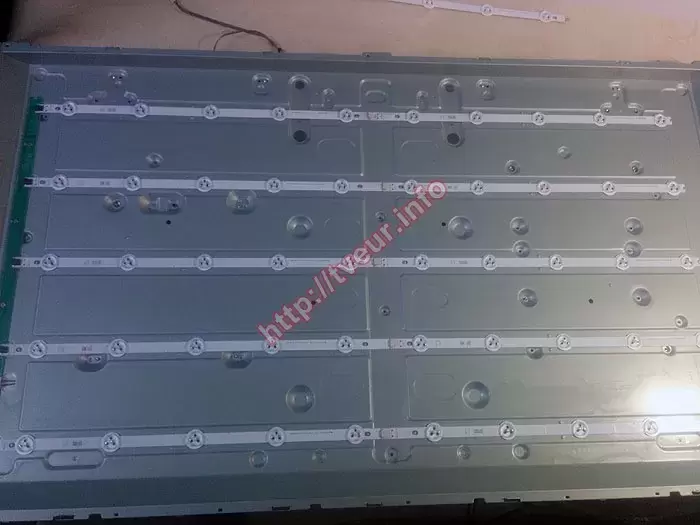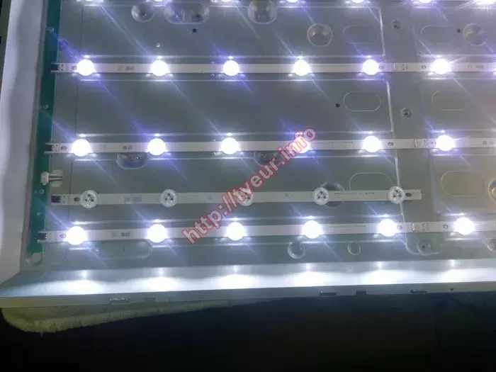 После полной разборки телевизора стало ясно, что конструкция подсветки представляет собой пять отдельных планок (линеек), каждая из которых содержит по 10 светодиодов, равномерно распределенных вдоль экрана. Перед тем как выполнять ремонт LED подсветки телевизора LG, специалист провел диагностику всех светодиодов с помощью тестера, проверялись как сами светодиоды, так и токоподводящие дорожки на платах. В ходе проверки выяснилось, что часть светодиодов либо перегорела, либо начала давать слабый свет, что свидетельствует о деградации. Учитывая, что установка новых отдельных диодов не обеспечивает равномерность свечения и может привести к повторному выходу из строя, было принято технически обоснованное решение заменить несколько планок подсветки целиком. Такой подход гарантирует стабильную и яркую картинку, равномерную засветку без пятен и полос, а также увеличивает надежность всей подсветочной системы.