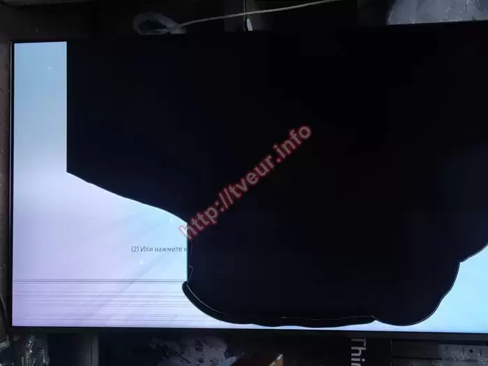 Повреждение матрицы оказалось критическим, большая трещина визуально разделила экран на две части. Внутри области с трещиной изображение полностью отсутствует, экран остается черным. На уцелевшей части дисплея сохраняется часть изображения и фрагмент надписи. Также по нижней рамке с левой стороны заметны тонкие горизонтальные полосы. Для того чтобы стала возможна срочная диагностика телевизора, потребовалось демонтировать заднюю панель. В данной модели задняя крышка удерживается плотными защелками, особенно тугими в угловых зонах, поэтому при разборке необходима аккуратность, чтобы не повредить корпус. После успешного демонтажа мастер приступил к проверке всех ключевых узлов устройства - блока питания, основной платы (Main Board), а также платы T-con. Диагностика показала, что при падении эти компоненты остались в рабочем состоянии, что позволило ограничиться заменой только поврежденной матрицы. После завершения осмотра была установлена связь с владельцем телевизора. Ему сообщили результаты диагностики, и по итогам обсуждения достигнута договоренность на проведение ремонта.