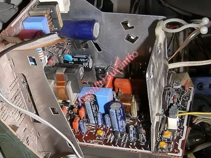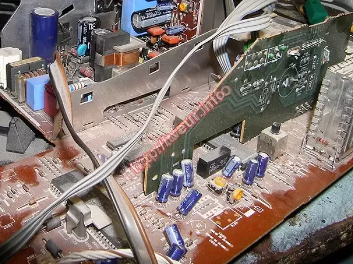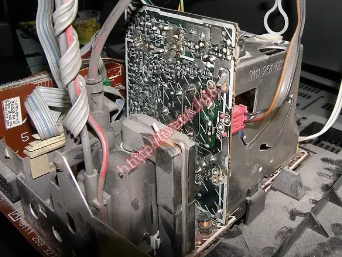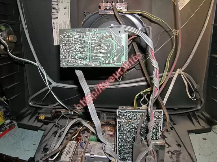 Приехал в сервисный центр с заявленной поломкой: заужено изображение по бокам – "подушка". Ремонт телевизоров выполнен в модулях питания и коррекции растра. Проведена регулировка геометрии, заменены С 100,0 * 160 В, 100,0 * 25 В, R 10 кОм.