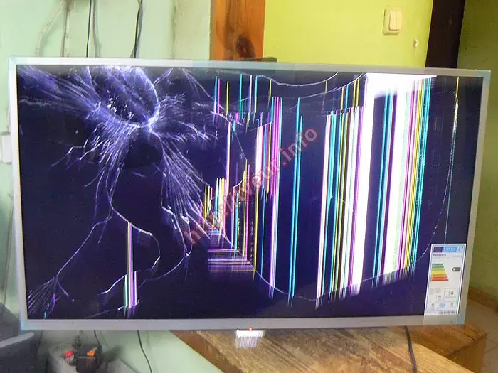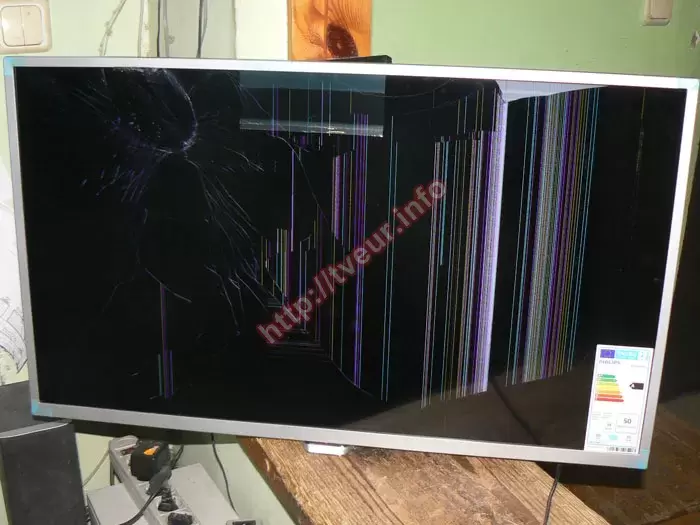 При первоначальном осмотре выяснили, что замена экрана на телевизоре Philips неизбежна, поскольку на нем многочисленные дефекты. В левом верхнем углу большой светящийся скол, вокруг которого «сетка» из мелких трещин. Кроме того, по всему экрану длинные трещины. Посередине матрицы между двумя большими трещинами многочисленные вертикальные разноцветные полосы разной длины. Ближе к правой боковой рамке столбцы с преобладанием белого цвета, возле верхней рамки белое треугольное пятно. Еще несколько цветных полос в районе под сколом. Выполненная диагностика показала, что из строя при падении вышла только матрица, внутренние компоненты (платы, подсветка, шлейфы) остались не поврежденными, поэтому их замена не требуется.
