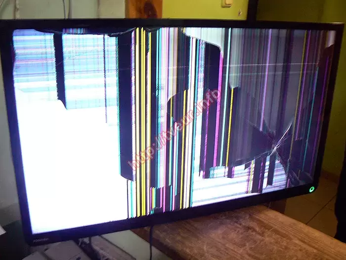 Первоначальный осмотр показал, что экран разбит очень сильно, он практически полностью весь в разных механических дефектах. С правой стороны образовался достаточно большого размера скол, от которого в разные стороны пошли трещины, причем разной длины. Между трещинами много разноцветных линий и столбцов, которые с разной шириной и длиной. Если присмотреться на матрице видны горизонтальные полосы. Середина экрана в светлых столбцах, по правую сторону от которых растровые пятна в розовых тонах. Прежде, чем выполнять замену ЖК экрана телевизора была проведена диагностика, с помощью которой выяснили, что при падении из строя вышла только матрица. Остальные составляющие, включая платы, подсветку, шлейфы, рамку, полностью в исправном состоянии.
