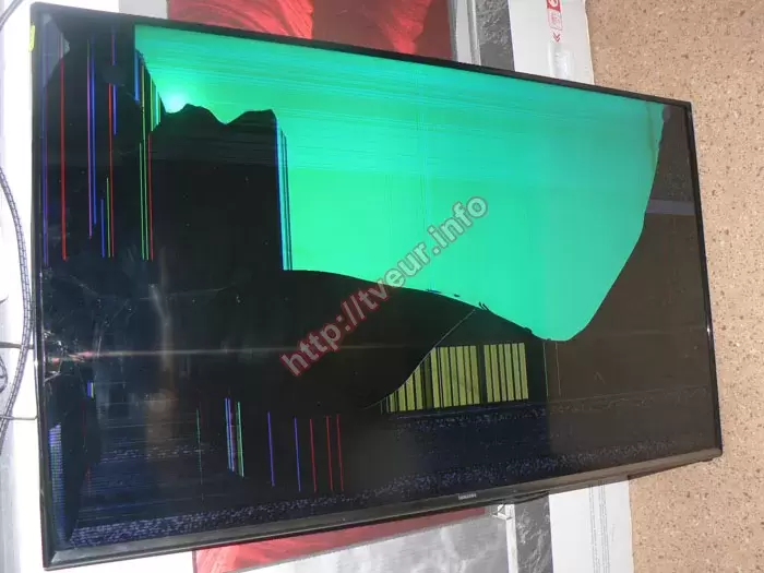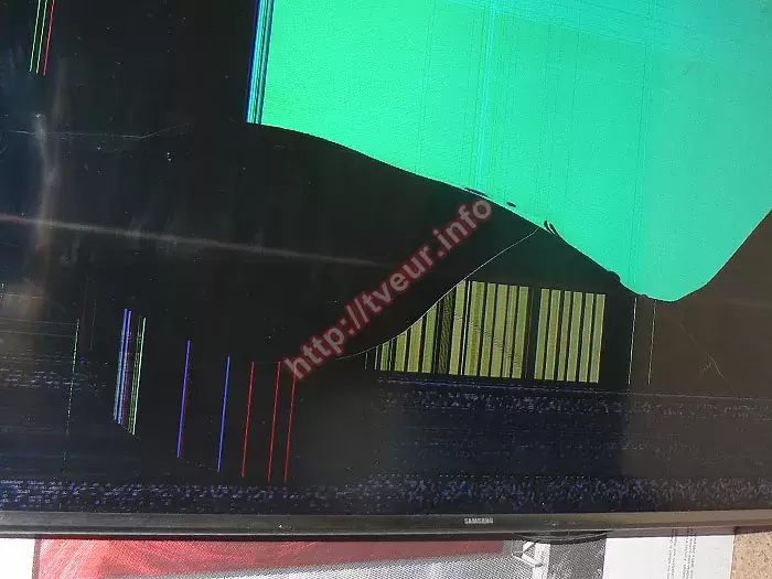 При первоначальном осмотре сразу стало понятно, что замена жидкокристаллического экрана неизбежна, так как он очень сильно поврежден. Из-за падения около боковой левой рамки появился скол, от которого много мелких трещин. Здесь же образовалось небольшого размера пятно серого цвета (предположительно отслоилась матрица). Несколько достаточно длинных трещин по всей матрице, одна из которых прошла до правого верхнего угла. Между трещинами цветные вертикальные трещины, внизу вдоль левой рамки видна широкая голубая растровая полоса. В верхней части матрицы большое пятно светло зеленого цвета. Под трещиной вертикальные коричневые столбцы. Вдоль нижней рамки полоса голубого цвета, немного левее появились горизонтальные линии. Выполненная диагностика показала, что при падении из строя вышла только матрица, требующая замены, все остальные составляющие телевизора остались в рабочем состоянии.