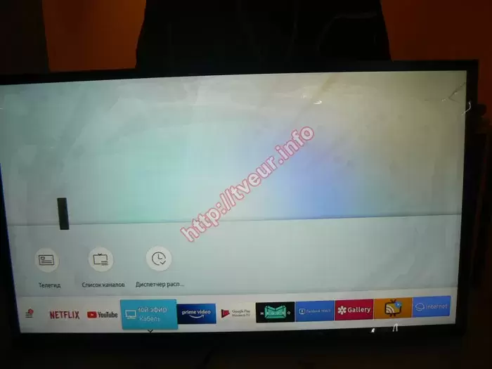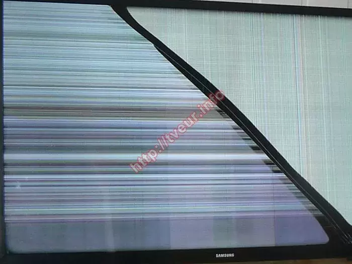 К нам в мастерскую обратился пользователь телевизора Samsung UE32N5300AUXUA, поскольку у него достаточно сильно повреждена (разбита) матрица. Он хочет, чтобы была выполнена замена разбитого экрана, а также сделана диагностика неисправностей телевизора, так как у него нет уверенности в том, что при падении не пострадали другие составляющие. Только после этого ним будет принято решение о том, выполнять этот сложный и дорогостоящий ремонт или купить новый телевизор. На приемке заказчик рассказал, что после приобретения телевизора его использовали на специальной тумбе, с которой его по неосторожности столкнули и он упал на пол экраном вниз. Когда его подняли, то сразу поняли, что на экране вместо изображения трещины и другие механические повреждения, изображения при этом отсутствует. После диагностики неисправностей телевизора и ремонта заказчик попросил сделать последующие тесты качества картинки.