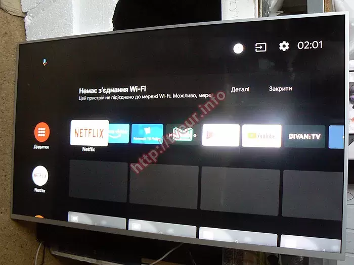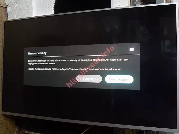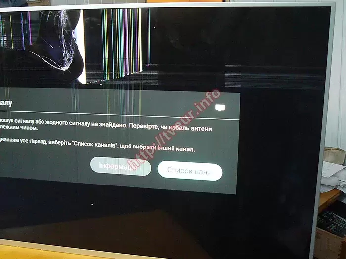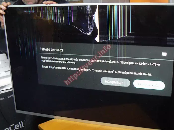 Первоначальный осмотр подтвердил, что удар по экрану был сильным. В верхней части матрицы сосредоточены основные механические повреждения, которые в виде большого размера скола и сетки, состоящей из мелких трещин. Несколько достаточно длинных трещин прошли по всему экрану. Также на экране появилось пятно белого цвета с вертикальными разноцветными линиями, еле просматривающимися. С левой стороны экрана много цветных вертикальных линиях с разной длиной. От трещины справа появились цветные столбцы. Посередине светится заставка «Немає сигналу. Виконується пошук сигналу або жодного сигналу не знайдено...». Очевидно, что с такой неисправностью возможна только замена разбитой матрицы телевизора, которая, как показывает практика обойдется заказчику значительно дешевле нового идентичного 55-дюймового телевизора.