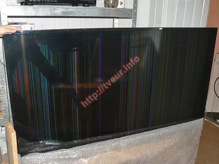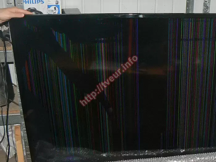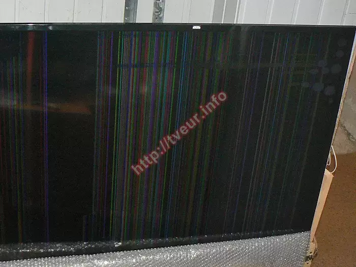 У нас всегда выполняется диагностика ЖК телевизоров, и данный случай не исключение. Как оказалось, по экрану был сильный удар каким-то острым предметом. Как результат на нем образовалась небольшая дырка, от которой в разные стороны много трещин, как коротких, так и длинных. Большое пятно черного цвета появилось в верхнем левом углу. Также по всему экрану ЖК телевизора многочисленные разноцветные вертикальные полосы. Такие дефекты указывают на то, что без замены матрицы не обойтись. Более углубленная диагностика показала, что все составляющие в рабочем состоянии.
