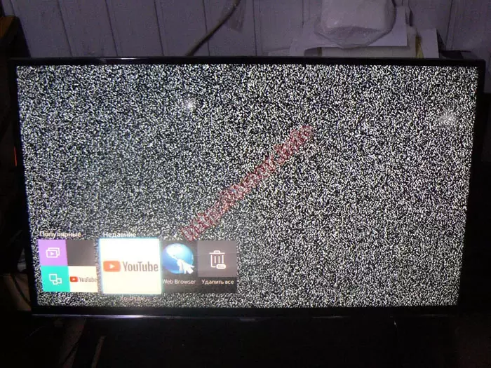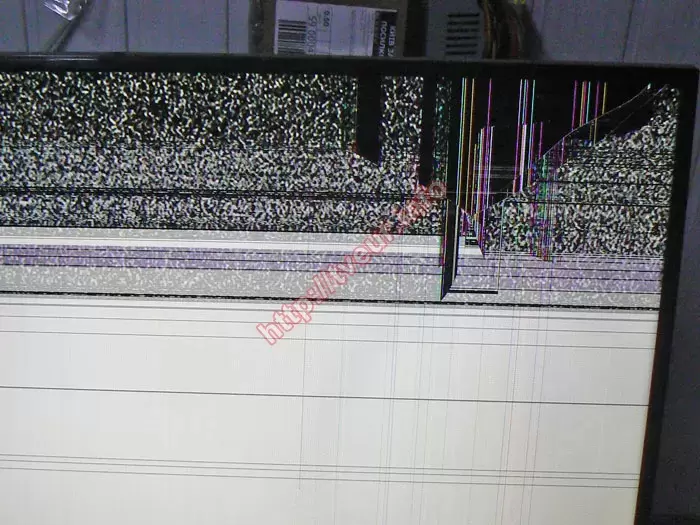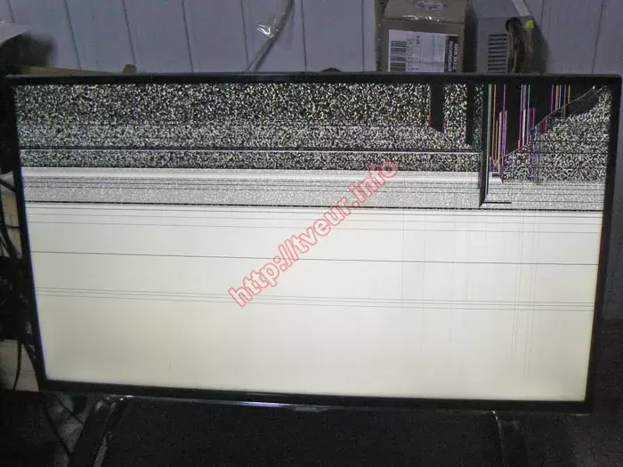 При необходимости у нас всегда выполняется срочная диагностика телевизора, и данный случай не исключение. Как оказалось, экран из-за сильного удара экран поврежден достаточно сильно, на нем многочисленные дефекты. В верхнем правом углу (именно сюда был удар), видны тонкие трещины. Выше трещин появились небольшой длины вертикальные полосы разных цветов. Нижняя часть матрицы залита белым цветом, здесь видны горизонтальные и вертикальные полоски. Немного выше появилась светло серая полоса, а еще выше темная.