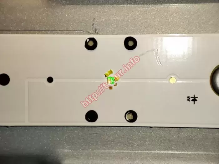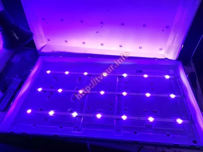 После включения телевизора в сервисном центре стало очевидно, что дефект имеет выраженный характер, изображение на экране буквально залито синим цветом, остальные оттенки выглядят блекло, почти неразличимо. В процессе диагностики, после разборки устройства, установлено, что в конструкции используются следующие модули: подсветка HC430DGG-SLTL3-9131, основная плата (Main board) LJ7 CHASSIS, TV-тюнер EBL61841001 TDJN-G501D, модуль питания PCB: EAX67209001(1.5), а также шлейфы EAD63986803, EAD63969910, EAD63969911. Также было выявлено, что в подсветке используется 3 планки, каждая из которых содержит по 7 светодиодов. Из-за длительной эксплуатации спектр свечения изменился, он стал синим с фиолетовым оттенком. Дополнительно было обнаружено, что под линзой одного из светодиодов кристалл сильно поврежден из-за перегрева, что и стало причиной визуального дефекта. В результате диагностики было принято решение, что ремонт подсветки телевизора LG будет заключаться в замене всего комплекта подсветки. Заказчик был проинформирован и дал согласие на проведение такого ремонта.