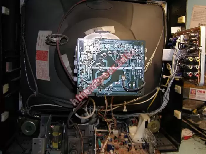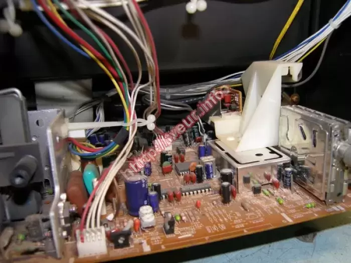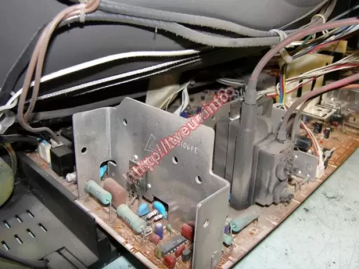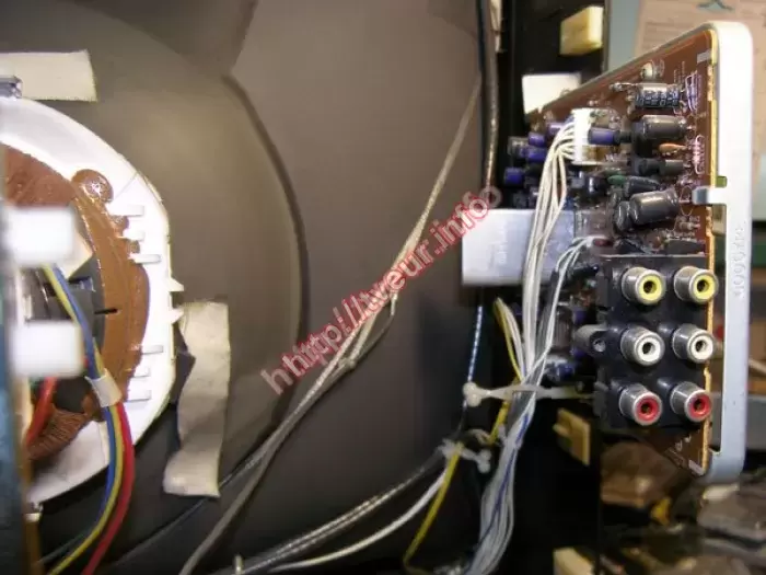 На экране кинескопного ТВ красно-синее изображение, отсутствует зеленый цвет. Дефект был на плате кинескопа, так как труба еще хорошая, то ремонт телевизоров заключался в пропайке данной платы. Также заменен резистор 2,7 кОм 0.5 Вт.