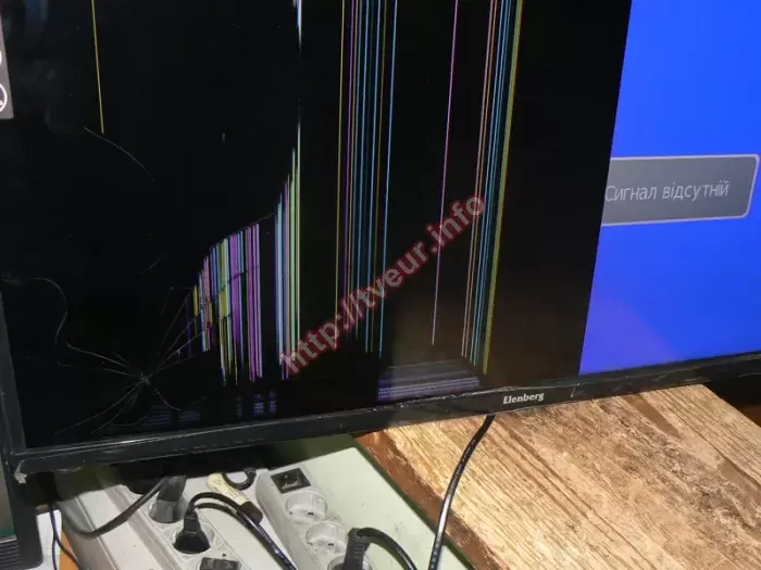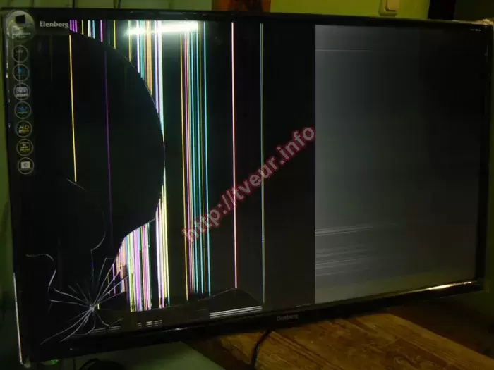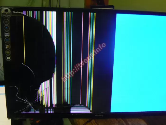 В сервисную мастерскую поступил жидкокристаллический (ЖК) телевизор с LED подсветкой - Elenberg 32AH4130, у которого в результате удара появились механические повреждения на матрице, она очень сильно разбита. Более того, пользователь пытался самостоятельно его вскрыть, поэтому утеряны несколько болтов. Как показывает практика замена ЖК матрицы телевизора в домашних условиях не возможна, поскольку это ремонт, относящийся к разряду сложных, требующий особых навыков, а также наличие специального оборудования. Данная модель, которая изготовлена в Китае в 2016 году, с 32-дюймовым экраном, углом обзора 178/178 градусов, яркостью 220 кд/м2 и контрастностью 4000:1. Осмотрев телевизор стало понятно, что экран безнадежно испорчен, поскольку на нем механические повреждения в виде трещин, причем в месте удара (нижний левый угол) они короткие и чем-то напоминающие цветок. Несколько длинных трещин, одна из которых уходит в левый верхний угол. Вторая вдоль нижней рамки - достаточно глубокие. Визуально панель разделена как бы на две половины. Ее правая часть голубого цвета, посередине темная полоска, а дальше матрица в многочисленных разноцветных вертикальных полосах (можно посмотреть на фото № 2). Кроме того, на голубой части панели просматривается часть заставки. Под нижней трещиной много горизонтальных полосок. С такими симптомами возможна исключительно замена ЖК матрицы телевизора, что было выполнено в стационарных условиях сервисного центра. После настроек этот телевизор полностью в рабочем состоянии.