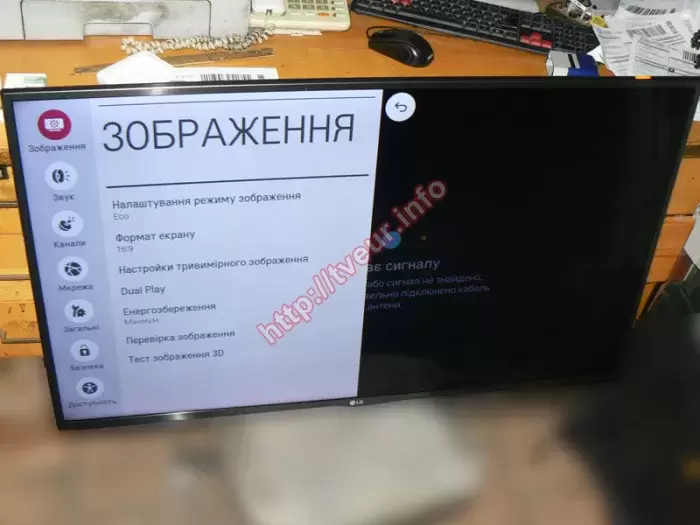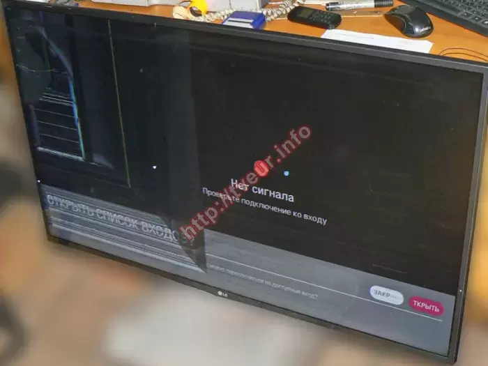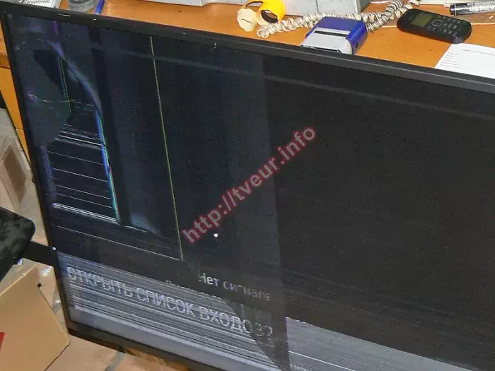 Поступил современный (собран в январе 2016 года) 3D телевизор LG 42LF650V, у которого в результате неаккуратного обращения очень сильно механически повреждена 42-дюймовая матрица. Пользователь попросил срочно купить экран для телевизора и выполнить замену. Такой ремонт по замене новой детали возможен только в стационарных условиях сервисного центра, где для этих целей предусмотрено специальное оборудование. При первоначальном осмотре стало понятно, что повреждения достаточно серьезные, после сильного удара, который пришелся вверху возле левой боковой рамки образовался скол, от него пошло несколько трещин, одна из которых достаточно длинная и кончается возле нижней рамки в районе логотипа. В месте удара серое круглое пятно, под ним много светлых, коротких горизонтальных линий. Чуть ниже белая полоса чуть длиннее, она соприкасается с полоской желтого цвета, которая пошла вверх. Визуально экран разделен как бы на три части, левая сторона темно серого цвета, правая более темная, а вдоль всей нижней рамки светлая широкая полоса, на которой отлично видны многочисленные полосы (см. фото № 1 и 2). Здесь же остались видны заставки, еще одна заставка есть посередине матрицы. Кроме того, на разбитой панели видны три достаточно крупные точки, две из которых белого цвета, а одна синего. Чтобы ремонт по замене стал эффективным, необходимо было купить экран для телевизора, причем учитывая те факторы, что данная модель с поддержкой 3D, Smart TV. Только потом можно демонтировать испорченную деталь и устанавливать новую. Все работы были выполнены результативно, на купленную матрицу выдана гарантия. После всех настроек этот телевизор с отличным качеством изображения.