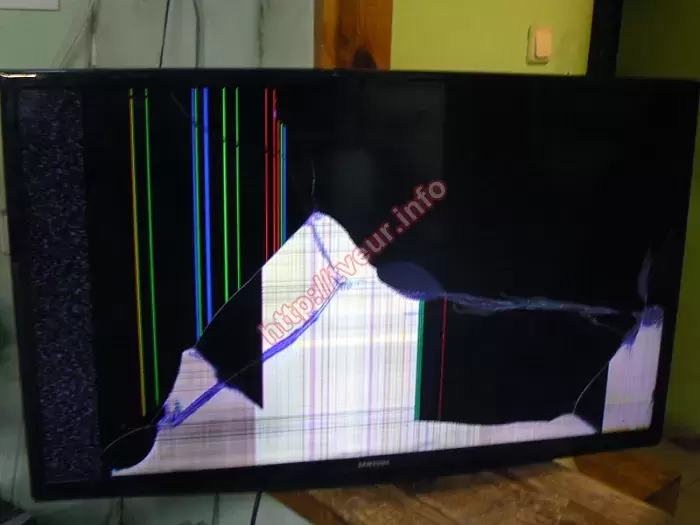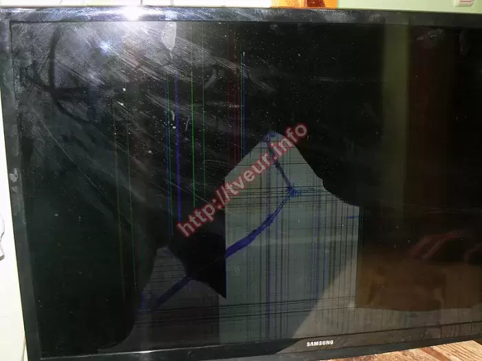 Поступил 32-дюймовый LED ЖК телевизор Samsung UE32J4100AU, у которого после падения со стены многочисленные повреждения на матрице. По этой причине пользователь попросил купить и поменять матрицу на телевизоре, так как считает, что ремонт гораздо выгоднее покупки нового телевизора. Данная модель, которая собрана в 2015 году, наделена самыми прогрессивными технологиями, в ней используется мощный процессор изображения, а угол обзора равен 178°/178°, как по вертикали, так и по горизонтали. Устройство поставляется со специальным креплением на стену VESA 100x100 мм, которое по какой то причине не выдержало и телевизор сорвался со стены. Застеленный ковром пол не смог уберечь тонкий и хрупкий экран от повреждений. На нем длинные и глубокие трещины, проходящие по экрану во все стороны, появились сколы, вся середина матрицы, а также правый нижний угол залит белым цветом, на нем просматриваются многочисленные пересекающиеся линии. На белом фоне отчетливо видна толстая, светящаяся синим цветом трещина, которая заканчивается круглым пятном серого цвета. Остальная часть панели черного цвета, только вдоль боковой левой рамки видна широкая полоса из серой ряби, правее от нее разноцветные вертикальные линии. В некоторых местах появились серые пятна, а это говорит о том, что в этих местах произошло отслоение матрицы. Чтобы поменять матрицу на телевизоре необходимо ее заказать и купить, учитывая разные нюансы. В данном случае не подошла версия, поэтому она была перезаказана еще раз. В последствии выполнен демонтаж разбитого экрана, только после этого поменяли его на новый. После всех последующих настроек, изображение отличного качества. Беречь в дальнейшем от падений, ударов и сотрясений!