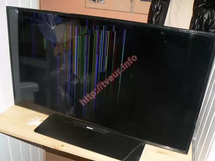 К нам в мастерскую доставили телевизор Philips 40PFT4319/12 с сильно разбитым 40-дюймовым экраном. На приемке заказчик рассказал, что во время игры дети каким-то предметом (предположительно игрушкой) ударили по телевизору. Он после покупки был установлен в нише мебели на подставке, которая предусмотрена в комплекте поставки. Также он рассказал, что данная модель польской сборки была приобретена в 2014 году и до момента механического повреждения еще из строя не выходила. Соответственно бесплатная диагностика телевизора и ремонт еще не выполнялись. После удара на матрице появились разного рода дефекты, при этом изображение полностью пропало. Он незамедлительно выключил телевизор и обратился за помощью.