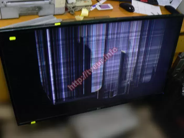 В 43-дюймовом Smart TV LED телевизоре LG 43UH603V, 2016 года сборки, вся матрица покрыта разного рода механическими дефектами. В данном случае возможна исключительно замена матрицы телевизора LG 43 цена на которую будет зависеть от многих факторов, включая ее диагональ, технические характеристики и т.д. Пользователь, который доставил телевизор в сервисную мастерскую объяснил, что неисправность произошла после того, как устройство экраном вниз упало с тумбочки на пол. Когда он его поднял, то увидел, что на матрице вместо изображения множество дефектов, чем то напоминающие «северное сияние». Первоначальный осмотр показал, что с правой стороны на панели образовалась дырочка не больших размеров, при этом от нее в разные стороны разошлись мелкие, тонкие трещины. Несколько длинных трещин прошли через всю матрицу, в некоторых местах контуры трещин светящиеся. При падении больше всего пострадала середина экрана. На нем многочисленные разноцветные полосы, как вертикальные, так и горизонтальные (хорошо видно на фото №1 и 2). Остальная часть матрицы залита черным цветом. Чтобы стал возможным такой сложный ремонт, как замена матрицы телевизора LG 43 цена на него согласована, прежде всего необходимо было заказать и купить новую, подходящую по всем параметрам панель. После ее получения телемастера сняли испорченную панель, а вместо нее установили ту, которую купили. В конце сделали все необходимые настройки. Цена новой матрицы и ее замены заказчика полностью устроила. Ему выдана гарантия.