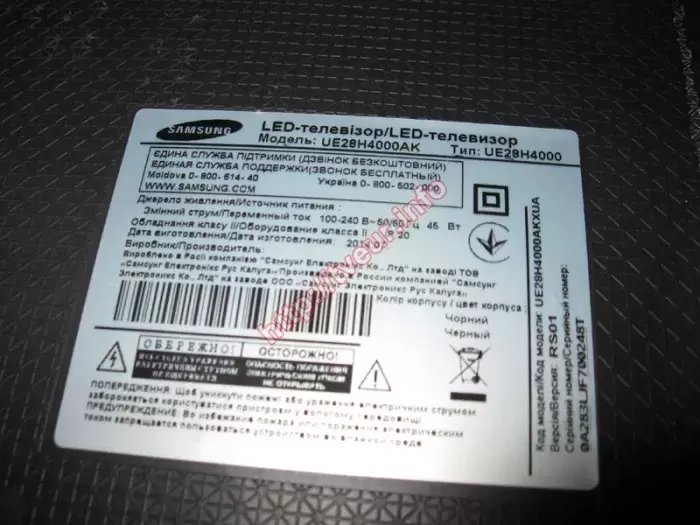 В телевизоре с LED подсветкой Samsung UE28h4000AK (2014 года выпуска) многочисленные трещины на 28-дюймовом (70 см) экране. Это значит, что замена матрицы телевизора станет неизбежной и должна выполняться в стационарных условиях сервисного центра. Это связано с тем, что такого плана ремонт является трудоемким и сложным, поэтому без особых навыков, а также наличия специального оборудования выполнить его не возможно. Данная модель со стильным дизайном, наделена широкоэкранным форматом (16:9), яркостью 250 кд/м2 и разрешением 1366 х 768 (WXGA). Устройство наделено такими функциями, как телетекст, автоматический поиск каналов, таймер выключения, а также игровой режим. С такой неисправностью как эта, когда на экране есть сколы или трещины, замена матрицы телевизора станет лучшим решением. В данном случае по экрану ударили, в результате вся матрица в трещинах, одна из главных которая - круговая. По бокам от которой другие трещины, разных форм, толщины и размеров. Внизу возле логотипа SAMSUNG образовалось светлое большое пятно, на котором много вертикальных и горизонтальных полос. Посередине экрана небольшое пятно в виде пятиугольника (фото № 4). В правом верхнем углу паутина из мелких трещин, а в левом верхнем углу светящаяся трещина, чем-то напоминающая рыбу скат. Над ней такое же светящееся пятно, но меньших размеров (хорошо видно на фото № 3). Нами была заказана новая матрицы, а после ее замены выполнены все необходимые настройки. Беречь от ударов!