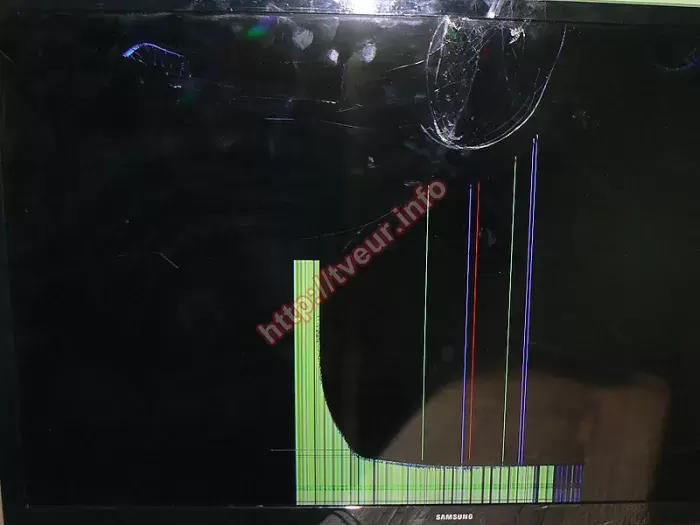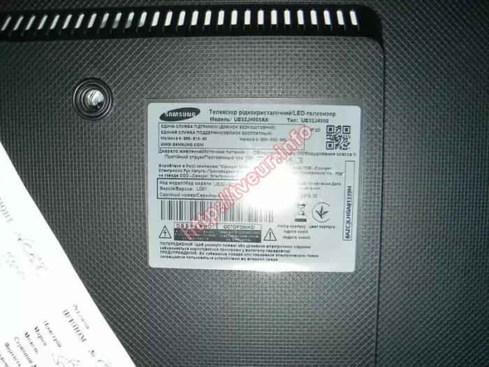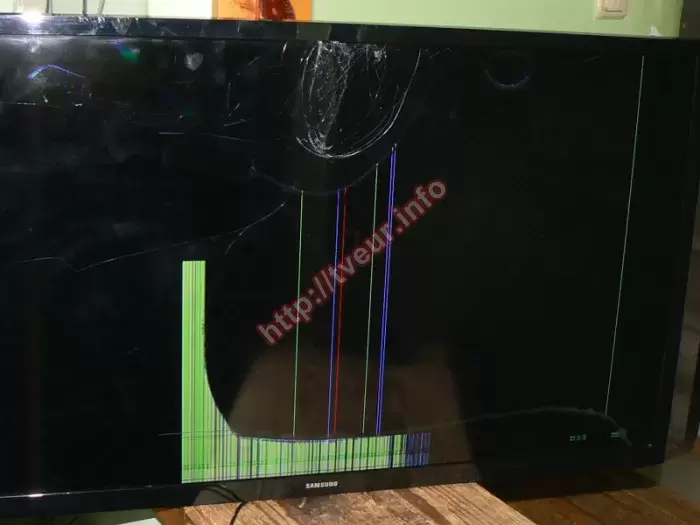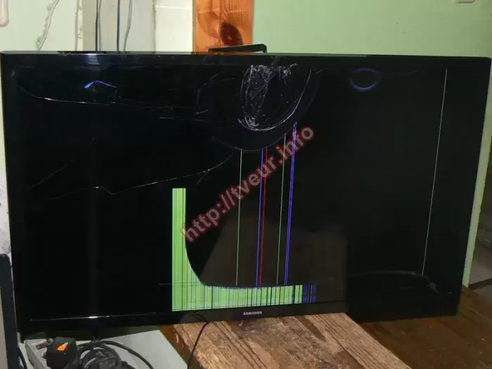 В результате сильного удара требуется срочная замена панели телевизора Samsung UE32J4000, который относится к модельному ряду 2015 года. По этой причине устройство доставлено в сервисную мастерскую, где для этих целей имеются соответствующие условия. Данная модель с диагональю панели 32-дюйма с разрешением 1366x768 пикселей. Наряду с настольным размещением, телевизор крепится на стену посредством крепления стандарта VESA 200х200. За качественное объемное звуковое сопровождение в телевизоре несут ответственность два динамика, суммарная мощность которых 10 Вт. Управлять и настраивать ТВ можно с помощью эргономичного пульта ДУ. Телевизор с хорошим набором интерфейсов, в число которых входит антенный вход, вход для наушников, SCART, USB и два порта HDMI. Как оказалось замена панели телевизора гарантированно станет неизбежной, поскольку на ней много трещин. Возле верхней рамки (посередине) многочисленные мелкие круговые трещины, чем-то напоминающие паутину. Несколько тонких, но длинных трещин пошли к левой боковой рамке. Внизу также есть одна крупная трещина, вверх от которой видны вертикальные цветные линии, посередине их пять, и еще одна - правее. Над логотипом образовалось пятно ярко зеленого цвета, состоящее из многочисленных линий (отлично видно на фото № 2 и 4). Из всего видно, что без замены новой матрицы не обойтись. Такой сложности ремонты, когда требуется демонтаж разбитого экрана и установка нового, являются достаточно сложными, поэтому должны выполняться опытными телемастерами. После всех вышеописанных работ и последующих настроек, этот жидкокристаллический телевизор с высоким качеством изображения. Не допускать в дальнейшем никаких механических воздействий на хрупкую матрицу!