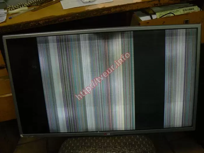 В телевизоре LG 32LB580V достаточно сложная поломка, на экране появились многочисленные разноцветные вертикальные полосы, изображения при этом нет. По этой причине просмотр телевизора стал невозможным. Такие «симптомы» указывают на то, что быстрее всего потребуется ремонт матрицы телевизора LG, что должно быть подтверждено выполненной диагностикой. От заказчика узнали, что телевизор приобретен достаточно давно и был установлен на стене, соответственно он уверен в том, что никаким механическим воздействиям он не подвергался. Вместе с неисправным телевизором клиент принес в сервисный центр оригинальный пульт дистанционного управления.