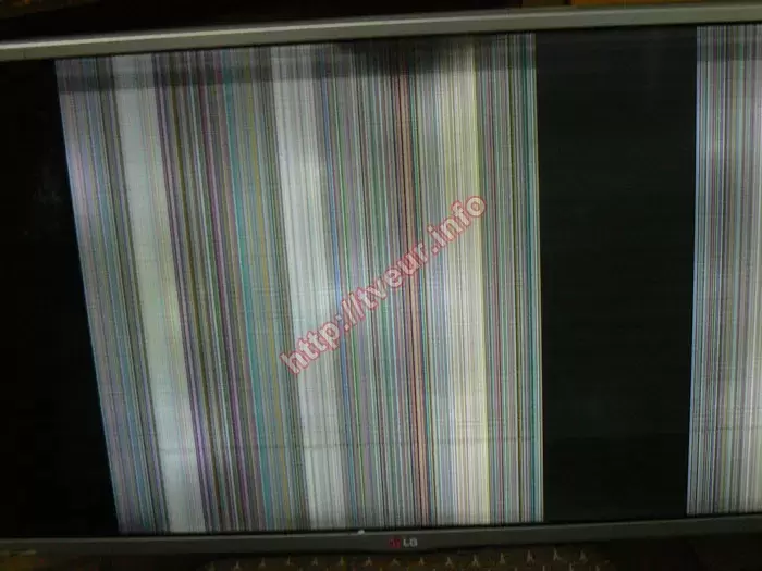 Когда телевизор включили непосредственно в сервисном центре стало понятно, что неисправность достаточно сложная. На экране вместо изображения много вертикальных разноцветных полос. Причем, возле правой боковой рамки полоса из разноцветных линий не такая широкая, за ней левее матрица черного цвета, потом более широкая цветная полоса, опять чередующаяся черным цветом. Очевидно, что гарантированно потребуется ремонт матрицы телевизора LG, при этом насколько он окажется сложным, можно будет судить только после углубленной диагностики. В ходе ее выполнения выяснили, что ремонт будет не простым, та как из строя вышли элементы матрицы, восстановить работоспособность которых не предоставляется возможным. Исходя из этого, для ремонта матрицы телевизора LG требуется их замена. Результаты диагностики сообщили заказчику и получив от него одобрение приступили к работе.