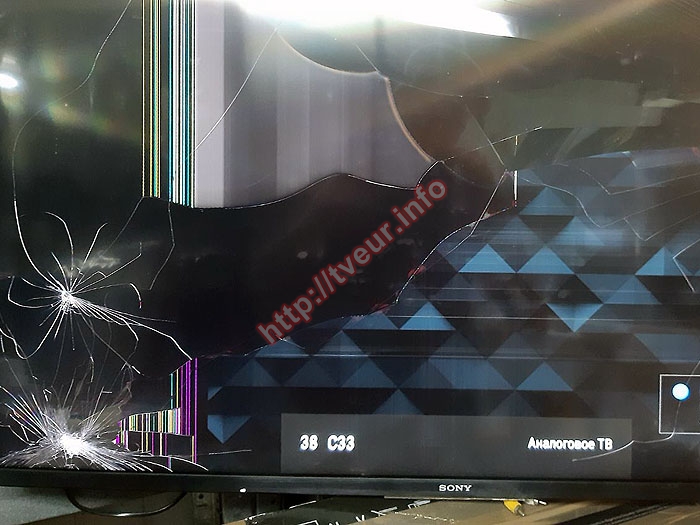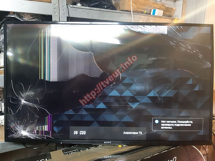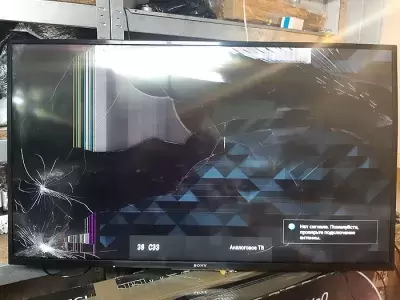 Во время первичного осмотра специалисты сразу отметили, что замена экрана телевизора Сони необходима в полном объеме. Поверхность панели имела множество механических повреждений. В левом нижнем углу виднелись два крупных светящихся скола (нижний особенно заметен), вокруг которых располагались мелкие трещины. Рядом со сколом наблюдалось серое пятно - типичный признак отслоения матрицы. Практически вся поверхность дисплея была испещрена трещинами разной длины и глубины. Вдоль верхней рамки заметно белое пятно неправильной формы, а чуть левее еще одно крупное пятно, переходящее в вертикальные полосы различного цвета и интенсивности. В нижней части, рядом со сколами, также проявлялись короткие разноцветные вертикальные линии. На части матрицы сохранилось изображение с надписью: «Нет сигнала. Пожалуйста, проверьте подключение антенны». Все эти повреждения, вызванные падением устройства, отчетливо видны на первых фотографиях. Чтобы провести детальную диагностику внутренних узлов и приступить к дальнейшему ремонту по замене матрицы, телевизор был аккуратно разобран. Для этого демонтировали пластиковую заднюю крышку корпуса. В процессе осмотра выяснилось, что внутренние платы, шлейфы и прочие компоненты не получили механических повреждений и остались в рабочем состоянии.