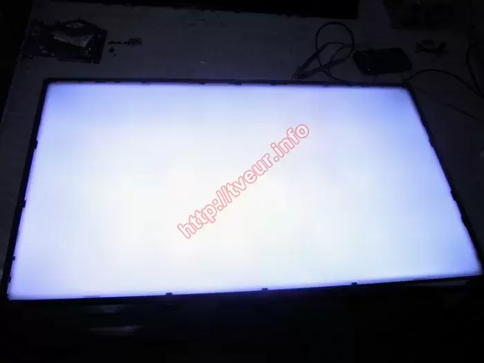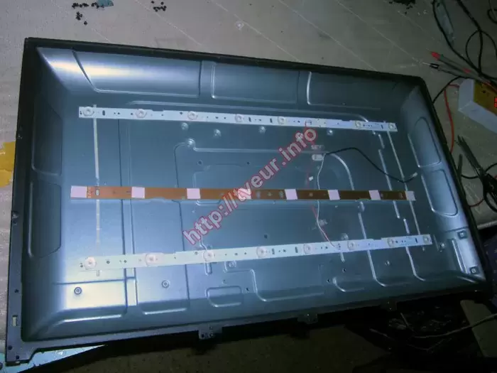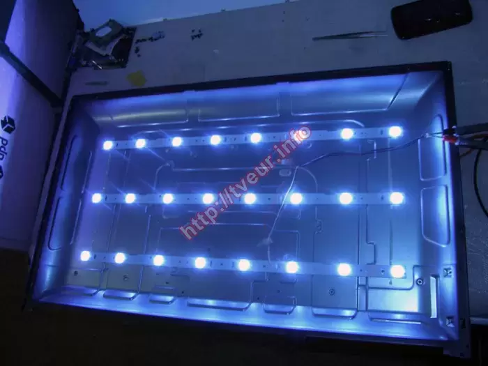 В первую очередь был осуществлен разбор телевизора, в ходе которого было установлено, что в нем применяется матрица TH315L422-07 и материнская плата TP.VST59S.PB813. Подсветка телевизора состоит из трех планок, на каждой из которых расположено по восемь светодиодов. В процессе диагностики стало очевидно, что для ремонта подсветки телевизора Bravis имеются все необходимые основания, так как модуль LED подсветки вышел из строя. Кроме того, на верхней планке был обнаружен перегорающий светодиод.