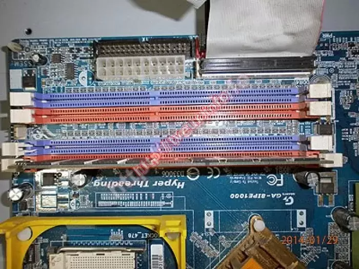 4. На любых системных платах имеются разъемы (слоты) оперативной памяти, которые находятся недалеко от сокета процессора и микросхемы северного моста. Именно в них вставлены модули оперативной памяти, причем их может быть разное количество - от двух (на более дешевых) до шести (на более дорогих). Данные слоты оперативной памяти связаны по шинам с северным мостом, а через него, уже непосредственно с центральным процессором.