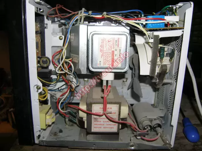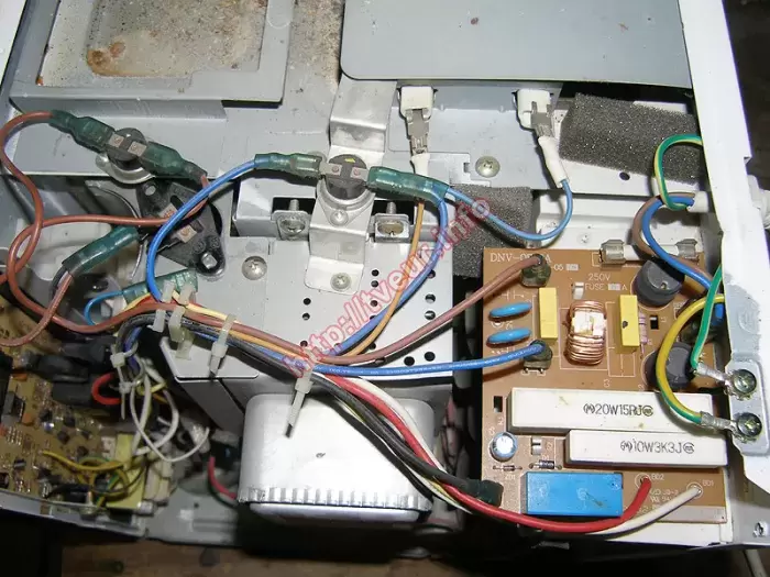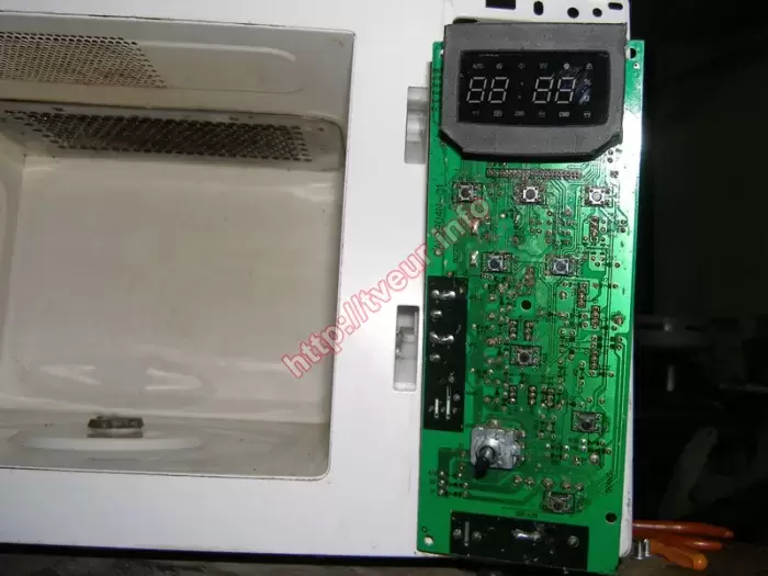 К нам в сервисный центр поступила СВЧ печь с набором неисправностей. Пользователю необходимо, чтобы ремонт микроволновых печей был срочным. В данном устройстве искрит при работе СВЧ, отсутствует нагрев, прогоревшая слюда, нет подсветки. Кроме того, до нас эту микроволновую печь уже ремонтировали, пытались восстановить сетевой трансформатор платы, но положительного результата это не принесло. Осмотрев визуально данную кухонную бытовую технику, мастером был сделан вывод, что она в удовлетворительном состоянии, поскольку видны следы тараканов, прогоревшая слюдяная пластина, N-кодер работает не четко. В данной модели используется магнетрон 2M253K(JT). Она работает под управлением платы управления GAL9904N-01, которая подлежала восстановлению. Эта микроволновка с объемом внутренней духовки 17 литров, дополнена грилем. Мощность микроволн 1200 Вт, а мощность гриля составляет 1000 Вт. В данном случае ремонт состоял в замене новой слюдяной пластины 110-70мм, лампочки 250в 25вт(миньон). Наряду с этим выполнена чистка волновода, ряд других профилактических работ, с разборкой и последующей сборкой техники. После ремонта эта микроволновая печь работает отлично, ее все функции восстановлены. Пользователь предупрежден о том, что после приготовления блюд устройство необходимо проветривать, обеспечить доступ воздуха через решетку вентилятора. Срочно начать борьбу с тараканами!