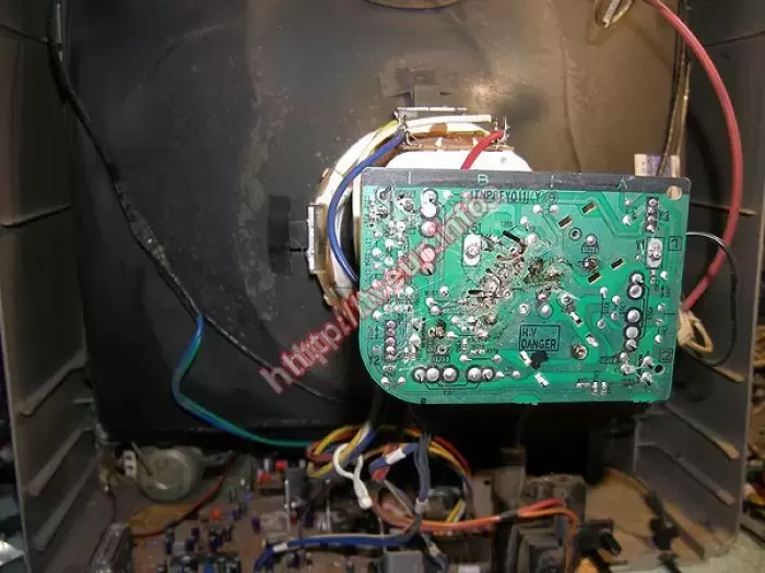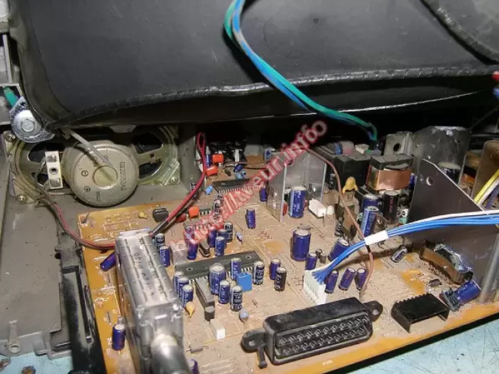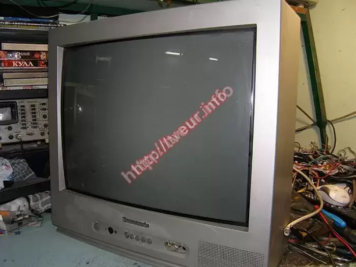 Не включается, после вкл.и замены кинескопа - нет изображения, черный экран. Была потеря вакуума старого кинескопа - из-за убитой кадровой ИМС (сместившимся лучом отрезало горловину). Заменены SMD-элементы, LA7840, регул. в сервис-режиме.