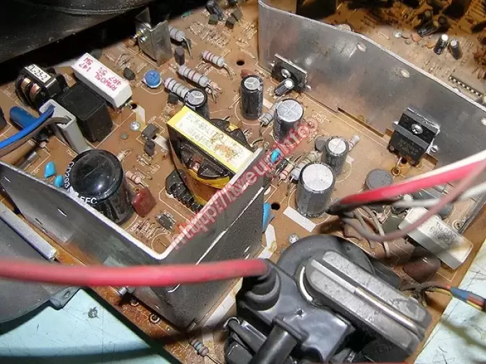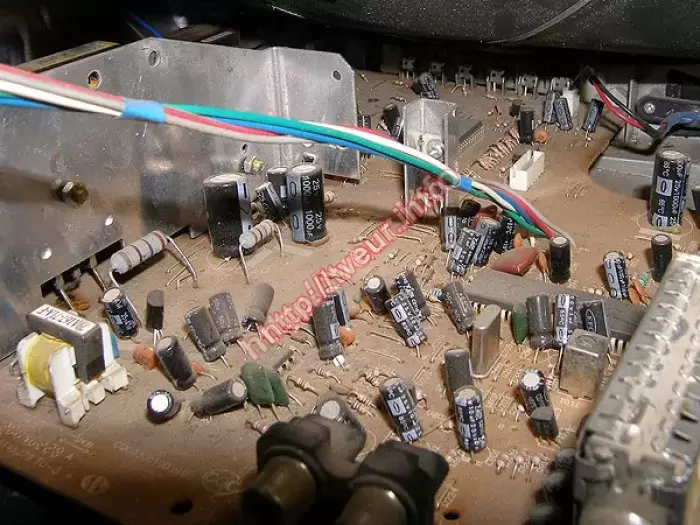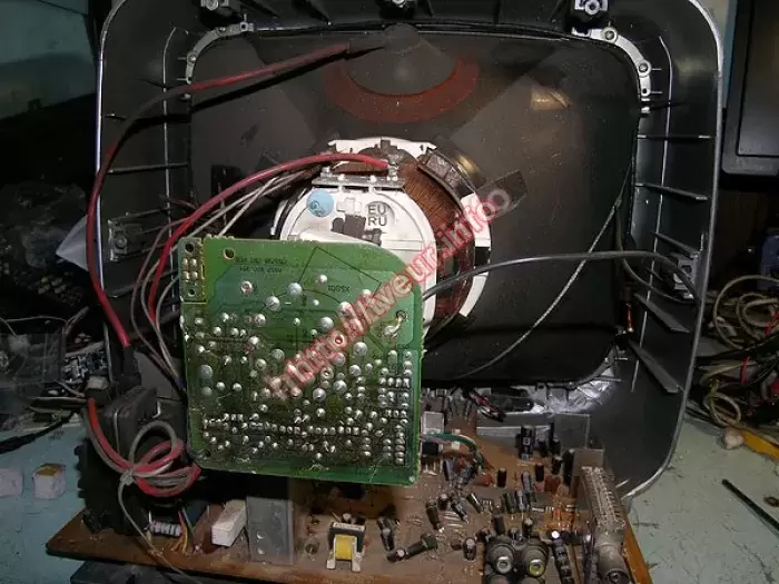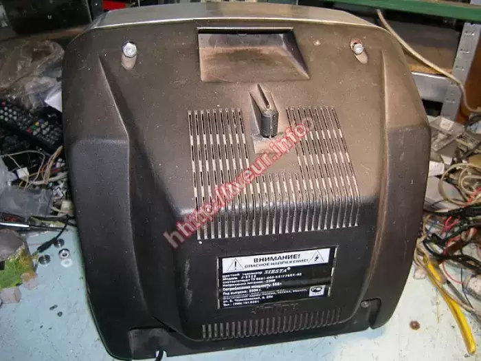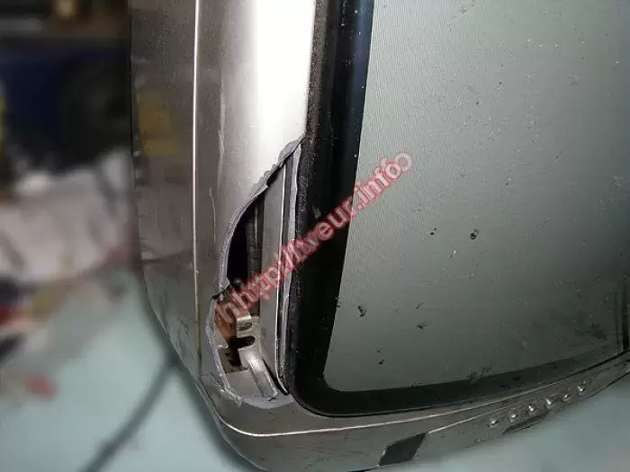 Кроме битого корпуса после падения обнаружены трещины в плате. Ремонт телевизоров был проведен в модулях строчной развертки и питания, состоял в восстановление монтажа платы, пропайке ТДКС и ТПИ, замене R 4,7 Ом 5 Вт и 3DD 2498.