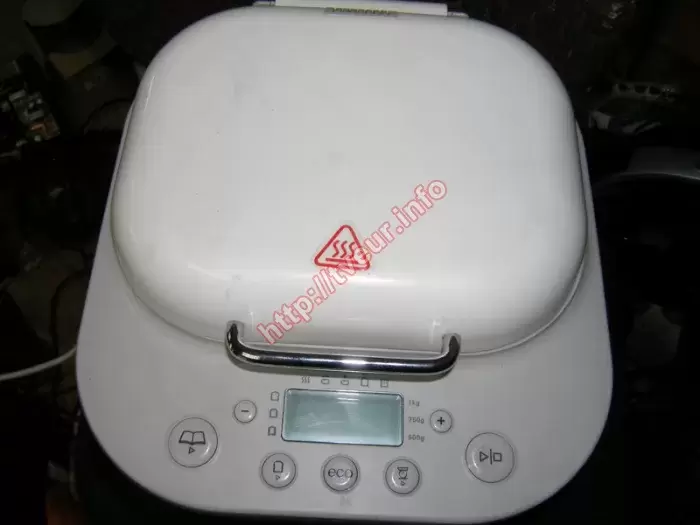 Хлебопечь Kenwood BM 260 не включается, как объяснил заказчик, который ее принес в наш сервисный центр, она перестала работать после того, как не допекся хлеб. Чтобы ремонт хлебопечек стал результативным, требуется диагностика, с помощью которой возможно максимально точно определить неисправность. Данная кухонная бытовая техника с прямоугольной формой для выпечки хлеба, кнопочным управлением, мощностью 455 Вт и наличием функции отсрочки старта до 15 часов. Устройство наделено 11 разными программами, выбором размера (веса) хлеба. Учитывая вкусовые предпочтения пользователь имеет возможность регулировать параметры приготовления хлеба, а именно, выбрать степень выпекания, цвет корочки. Вес можно устанавливать от 500 грамм и до 1 килограмма. После приготовления поддерживается температура хлеба на протяжении 60 минут. Разобрав эту бытовую технику (см. фото № 5) и сделав диагностику стало понятно, что сгорела плата питания. Восстановить ее работу не возможно, поэтому ремонт хлебопечек состоял в замене новой платы AP3706 G1, EU13003E. Благодаря этому удалось полностью решить проблему. После ремонта хлебопечь работает хорошо во всех режимах.