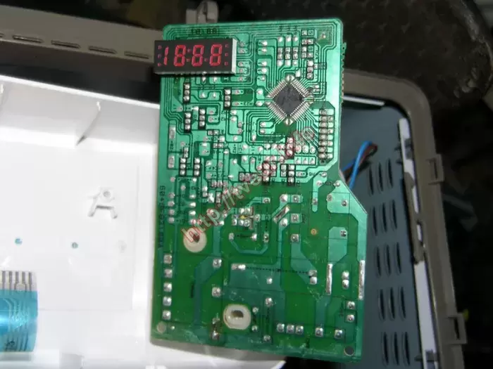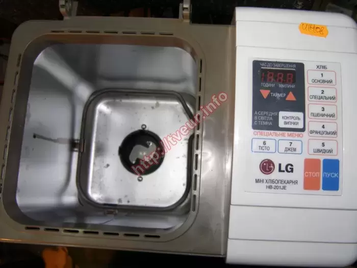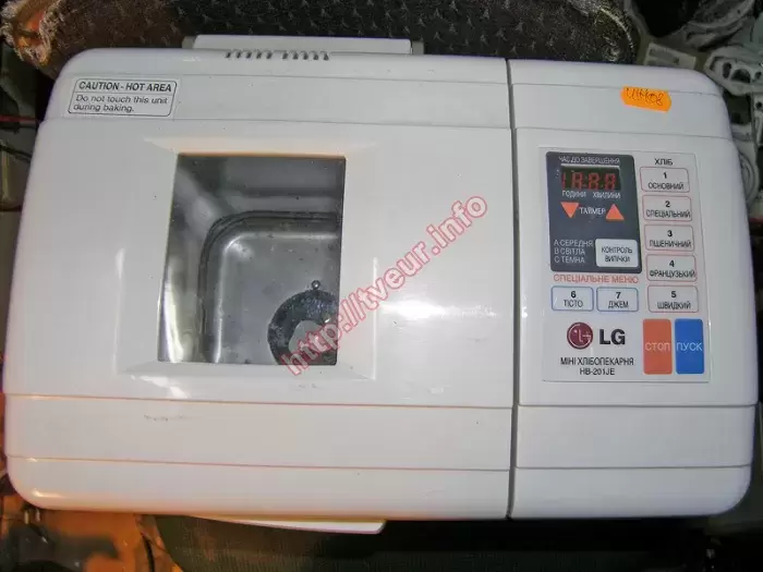Хлебопечка LG HB-201JE с мощностью 550 Вт и объемом 0.9 литра не включается, а это значит, что нужен ремонт хлебопечек, выполняться который должен в стационарных условиях мастерской. Эта модель наделена семью автоматическими программами, у нее имеется сохранение программы при отключении. Устройство с горизонтальным способом загрузки ингредиентов и смотровым окном на дверце. После выпекания, хлеб может оставаться теплым на протяжении трех часов. Хлебопечка с сенсорным типом управления, у нее имеется LED дисплей. В данной бытовой кухонной технике можно испечь пшеничный хлеб, специальный хлеб, французский хлеб, замесить тесто, приготовить джем. Кроме того, пользователь имеет возможность выбрать цвет корочки (средний/светлый/темный). Хлебопечь поступила в хорошем состоянии, она чистая и не зажирена (отлично видно на фото № 1 и 2). При этом видны следы взлома, пользователь хотел самостоятельно решить проблему. Но у него ничего не получилось. С такой неисправностью, как эта, ремонт хлебопечек выполнялся в плате управления, которая вышла из строя (фото № 3). Поломку удалось устранить, перепаяны некоторые детали. Выполнено восстановление сетевого трансформатора. После вышеописанного ремонта, устройство включается.