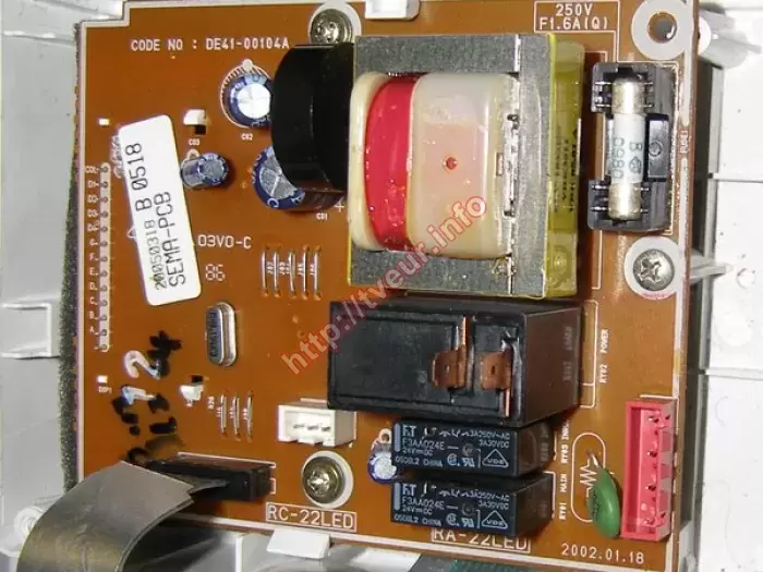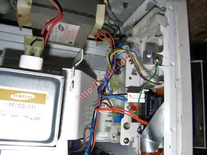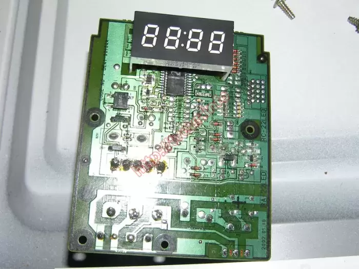 Отдельностоящая микроволновая печь без гриля Samsung M1833NR, в которой используется магнетрон OM75S(31) и плата управления SAMSUNG RA-22LED RC-22LED DE41-00104A перестала включаться. Пользователь, который принес ее в наш сервисный центр, чтобы был выполнен ремонт микроволновых печей, рассказал, что ее самостоятельно вскрывали, поскольку при открытии двери она сама крутит тарелку. Данная модель с мощностью 800 Вт и объемом духовки 23 литра, наделена сенсорным (электронным) управлением, а также 6 уровнями мощности (высоким 800 Вт, умеренно высоким 600 Вт, средним 450 Вт, умеренно низким 300 Вт, размораживание 180 Вт и низким 100 Вт). В этой СВЧ печи используется технология С.Т.Р. (система трехмерного распределения микроволн), с помощью которой максимально эффективно распределяются микроволны, обеспечивая равномерное приготовление блюд. С такой поломкой как эта, ремонт микроволновых печей будет сложным. Это подтвердила выполненная диагностика, которая показала, что из строя вышли плата управления, блок коммутации. Более того, из-за того, что до нас эту бытовую технику пытались ремонтировать не профессионалы, не корректно установлен блок управления (он перекошен), блок коммутации не закреплен, также произошел обрыв первичной обмотки сетевого трансформатора блока управления. Все это осложняет выполнение ремонта, который состоял в восстановлении работоспособности, вышедших из строя модулей. Перепаяны некоторые детали. Впредь использовать микроволновую печь правильно, после приготовления блюд проветривать, не доверять ее ремонт не профессионалам.