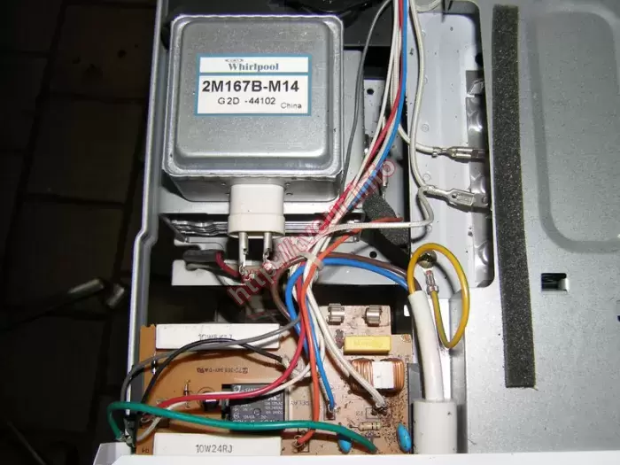Обычная отдельно стоящая, уже немного устаревшая микроволновая печь Whirlpool M561 не включается, у нее при работе искрит СВЧ. С такой заявленной неисправностью ее принесли в нашу сервисную мастерскую, где послегарантийный ремонт микроволновых печей и другой бытовой техники выполняется независимо от сложности неисправности, года выпуска или других факторов. Данная бытовая техника в удовлетворительном состоянии, в ней отсутствует куплер, внутри она грязная и в жиру. Также очень сильно прогорела слюдяная пластина. Более того, до нас ее уже ремонтировали, вскрывали, помочь не смогли. В результате был разобран предохранитель, на клеммах остались колпачки. Это максимально осложняет ремонт микроволновых печей, при этом наши мастера точно знают как его выполнять. В данной модели используется магнетрон 2M167B-M14. Во время выполнения программы диагностики мастер сделал заключение, что проблема возникла в работе волновода. Это является достаточно сложной неисправностью. Кроме того, из строя вышла сетевая плата. В данном случае ремонт состоял в возобновлении работоспособности, вышедших из строя модулей, сделана чистка волновода, на сетевой плате перепаяны некоторые детали. Также пришлось заменить новую слюду 70-130мм. Теперь эта микроволновка работает отлично. После приготовления блюд проветривать! За внутренней духовкой ухаживать, не допускать скопления в ней грязи и пыли.