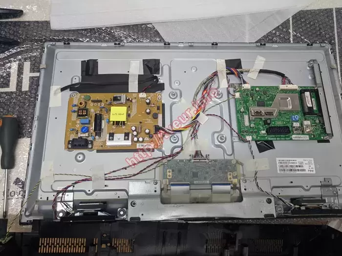 Общее состояние этого телевизора достаточно хорошее. При попытке включить его в сервисном центре положительного результата это не принесло. Для выполнения диагностики и последующего ремонта ЛЕД телевизоров Philips его разобрали и узнали, что в данной модели применены такие детали, как плата Main board 715G8659-M01-000-004Y, блок питания 715G7734-P01-005-002H TPV, трансформатор 3806L32P145H. В ходе углубленной диагностики точно установили, что из строя вышел блок питания, на котором погорело много разных радиодеталей. На крышке внутри не вооруженным глазом видны следы нагара из-за сильно сгоревших компонентов на блоке питания.
