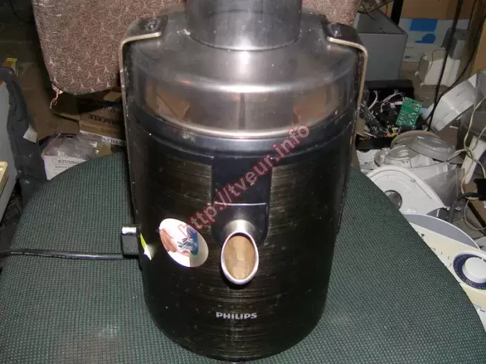 Соковыжималка Philips HR 1866 отличается не только стильным, современным внешним видом, у нее еще хорошие технические характеристики. При этом она вышла из строя, а именно не включается, поэтому ремонт соковыжималок станет неизбежным. Как оказалось, после того, как по неосторожности сетевой шнур попал на конфорку, он расплавился. Об этом рассказал заказчик. Кроме того, само по себе устройство не ухоженное, на корпусе видны потеки (особенно отчетливо видно на фото № 2). Низ бытовой техники весь в царапинах, в некоторых местах видны даже сколы. На резиновых ножках налипло много грязи. Данная модель с большой камерой для подачи разных овощей и фруктов целиком, к примеру, яблок, моркови, груш и т.д., (диаметр загрузочного отверстия составляет 74 мм), что значительно упрощает процесс приготовления фреша. У соковыжималки две скорости, имеется защита от протекания (благодаря системе «капля стоп» предотвращается просачивание сока). Поскольку из строя вышли сетевые цепи, ремонт соковыжималок состоял в их восстановлении. Помимо этого выполнена чистка устройства, заменен сетевой шнур длиной 15 метра с евровилкой. После ремонта обращаться с бытовой техникой более аккуратно!
