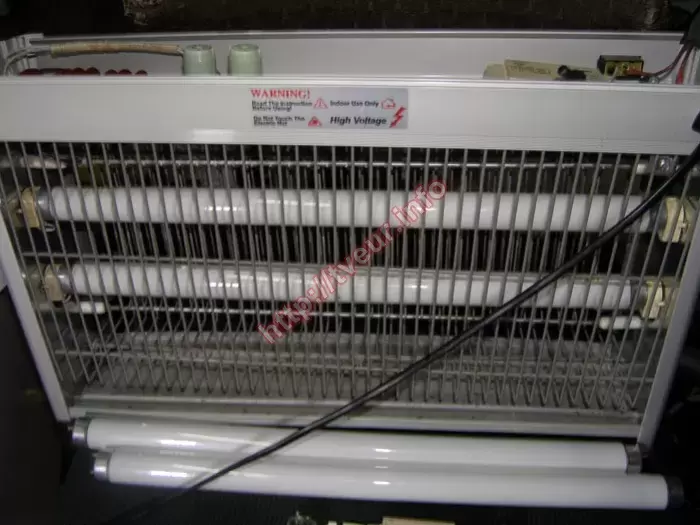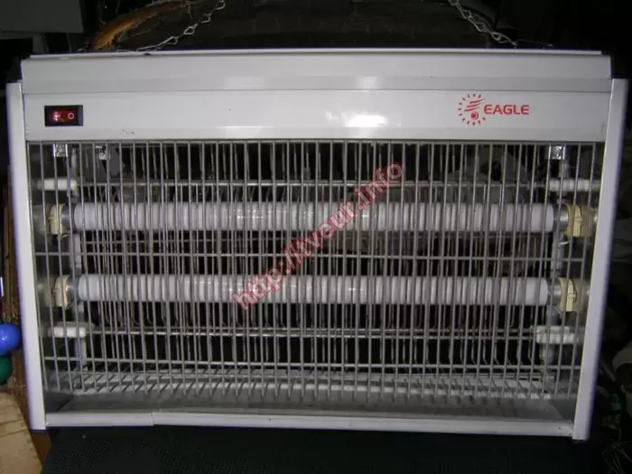 Электронный уничтожитель летающих насекомых Eagle IK 201 перестал нормально работать, он не включается. Заказчику требуется срочный ремонт бытовой техники, которая по его словам ежедневно используется на базе отдыха. Данная бытовая техника - это уничтожитель комаров, мух и других летающих насекомых, он предназначен для коммерческого и промышленного применения (рестораны, кафе, базы отдыха, бары, небольшие магазины). С его помощью можно легко избавиться от насекомых на площади до 120 кв.м. Принцип работы этой ловушки для насекомых достаточно простой, в роли приманки применены две люминесцентные лампы по 15 Ватт каждая с ориентировочным сроком службы от 5000 до 8000 часов (см. фото №1 и 2). Вокруг лампы имеется специальная сетка, через которую проходит ток с напряжением 1000 Вольт. Вредители, подлетая к лампе, уничтожаются электрическим разрядом, попадая на съемный поддон, с которого их легко удалить.