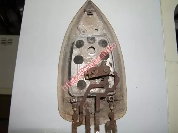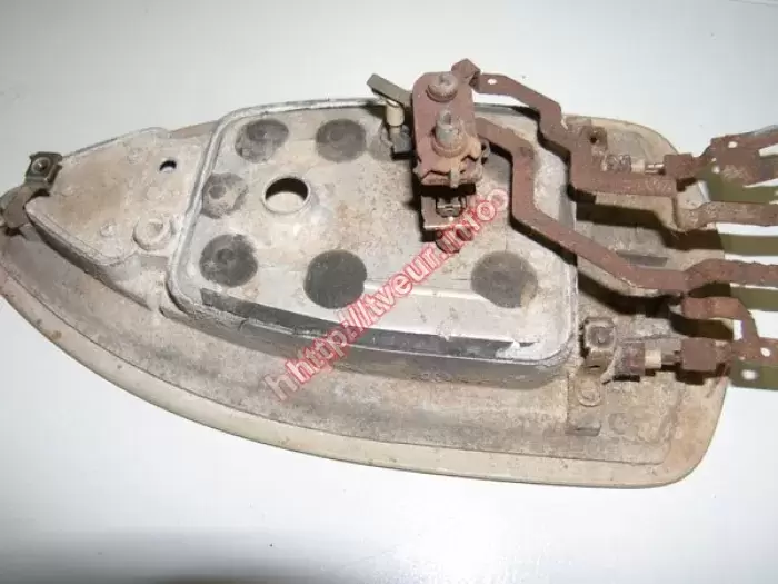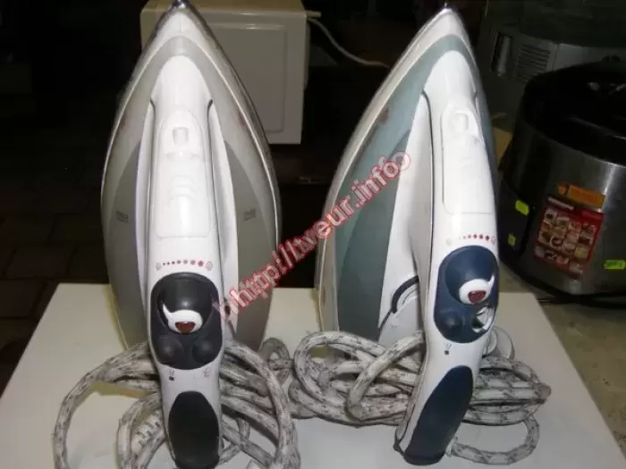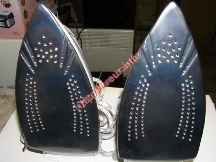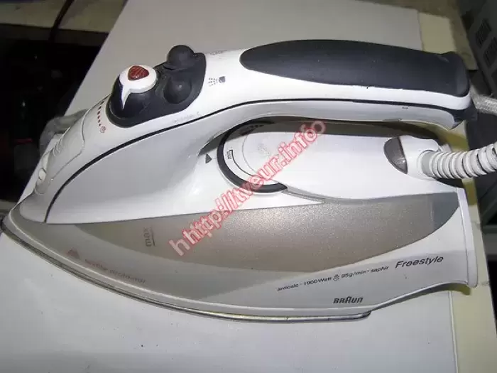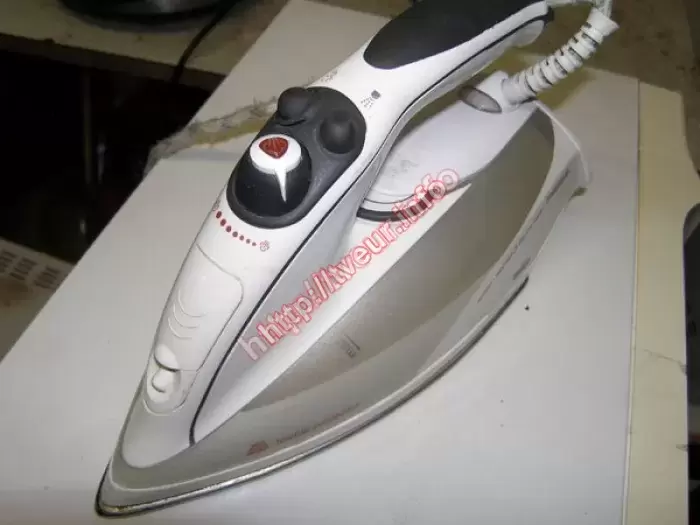 Утюг с паром Braun SL 6595 мощностью 1900 Вт перестал включаться. После предварительного осмотра стало понятно, что утюг в неудовлетворительном состоянии, поскольку подошва сильно запылена, толкатель помпы отсутствует, терморезина усохла, блок коммутации сгорел, силиконовая замазка вздулась. В таком состоянии данная модель поступила в наш сервис, но несмотря на это, был выполнен ремонт утюгов. В данном случае пришлось собрать один утюг из двух, выполнить ряд других профилактических работ. После такого достаточно сложного ремонта, устройство будет греть, но пара не будет.