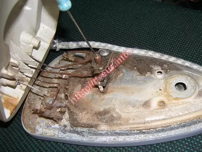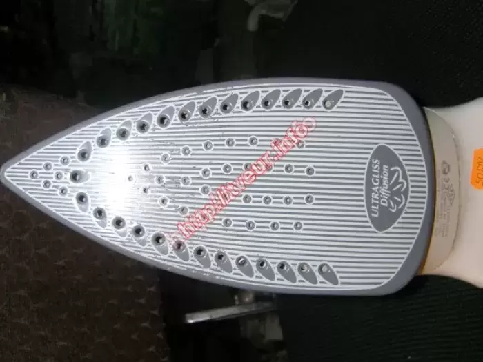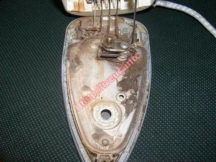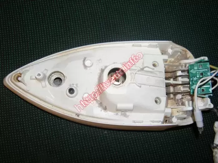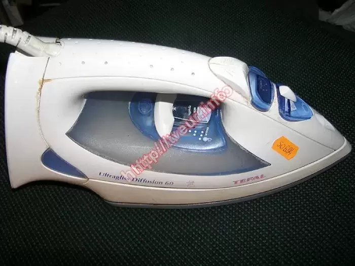 Утюг Tefal 1765 мощностью 1600 Вт и паровым ударом не включается, заказчик просит заменить шнур. После предварительного осмотра выяснилось, что устройство в ужасном состоянии - подошва сильно запылена, в потеках, терморегулятор ржавый, его заклинило, сетевые выводы ржавые, термосиликон потрескался, трещина на ручке. Даже в таком состоянии мы беремся за ремонт утюгов. Был заменен сетевой шнур, выполнена чистка внутри, профилактика. Использовали термосиликон. После ремонта утюг работает хорошо, но гарантию на длительное время дать не можем.