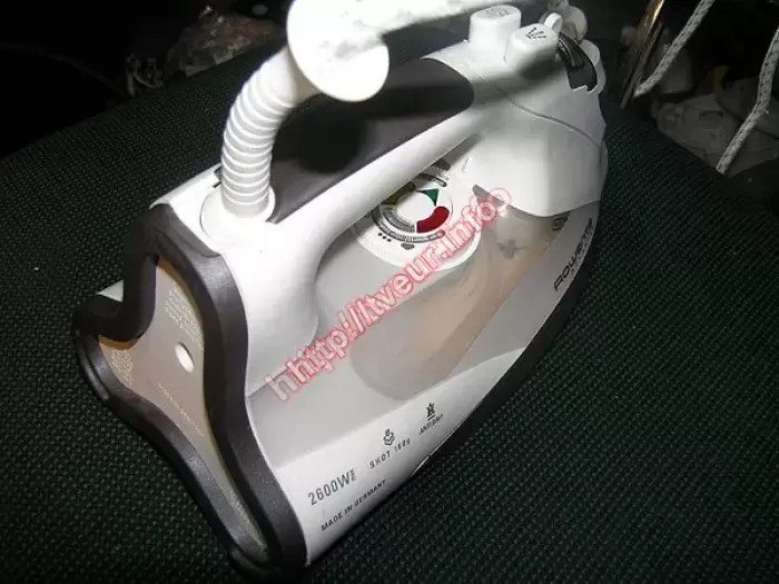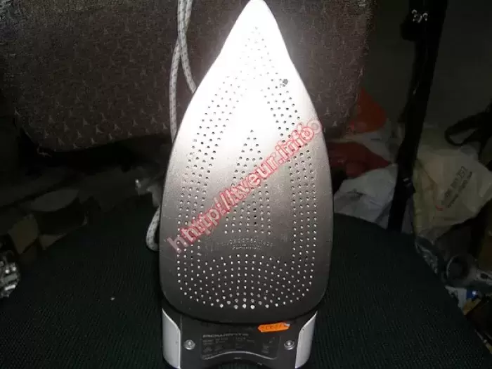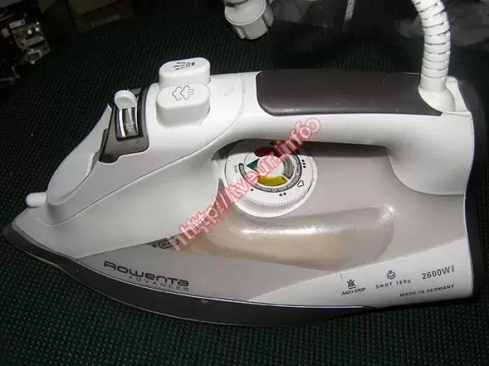 Утюг Rowenta DZ9130 мощностью 2600 Вт, у него подошва из нержавейки и мощный паровой удар. Он не включается. После осмотра, стало ясно, что устройство в удовлетворительном состоянии - ранее вскрывалось, сетевая колодка прогорела, на ней обломаны фиксаторы, делали перекоммутацию, на свободное гнездо перенесли один вывод, подошву реставрировали, нанесли термосиликон, индикации почти не видно. Даже с такой поломкой мы выполняем ремонт утюгов, который состоял в восстановление сетевых цепей. После ремонта, осталась слабой индикация, плата управления может выйти из строя.