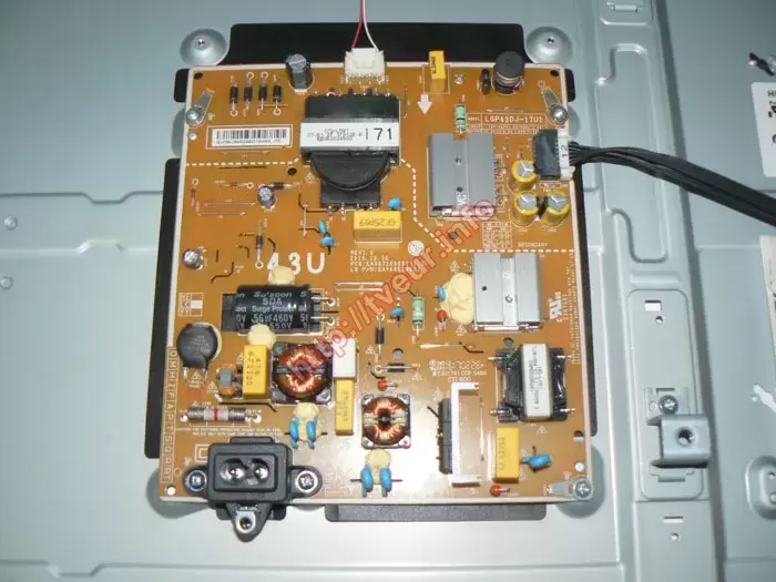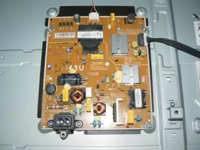 В условиях сервисного центра телевизор также не подавал никаких признаков жизни, индикатор дежурного режима оставался неактивным, а устройство не реагировало на кнопку включения. Чтобы точно установить причину неисправности и определить, каким образом будет выполняться ремонт ЖК телевизора LG, специалист провел тщательную диагностику. Для доступа к внутренним компонентам он аккуратно снял заднюю крышку корпуса. После вскрытия стало ясно, что в конструкции данной модели используются следующие основные элементы: системная плата Main Board LJ7 CHASSIS, матрица HC430DGG-SLTL3-9131, шлейфы EAD63969910, EAD63969911, EAD63986803, тюнер EBL61841001 TDJN-G501D, блок питания LGP43DJ-17U1 PCB:EAX67209001 (1.5), а также акустическая система - динамики EAB64028307/EAB64028308. В ходе диагностики были поэтапно проверены все ключевые узлы телевизора: материнская плата, инверторная часть, цепи питания и сигнальные соединения. Измерения показали, что на выходах блока питания отсутствуют необходимые стабилизированные напряжения, что указывает на неисправность данного модуля. При детальном осмотре были обнаружены несколько пробитых диодов, вздутые электролитические конденсаторы, а также повреждённый транзистор, отвечающий за запуск и преобразование входного напряжения. Несмотря на количество выявленных дефектов, мастер определил, что блок питания подлежит восстановлению - возможно провести ремонт на компонентном уровне с заменой поврежденных радиодеталей без установки нового модуля. Такой подход позволяет сохранить оригинальные узлы телевизора, снизить общую стоимость работ и сохранить заводскую архитектуру устройства.
