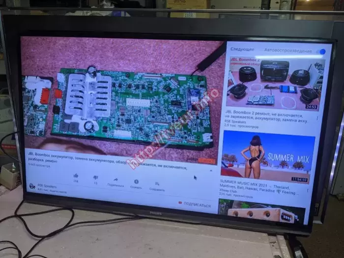 В сервисный центр поступил телевизор Philips 42PFL6097T, основная жалоба — не выходит из режима ожидания. Как пояснил владелец, неисправность проявилась неожиданно, экран не включался, а индикатор оставался в режиме standby. Сначала он обратился к мастеру, обслуживающему на выезде. Тот провел первичную диагностику и пришел к выводу, что неисправность кроется в центральной плате. Однако попытка отремонтировать ее на месте успехом не увенчалась — телевизор так и не запустился. Тогда заказчик решил передать устройство в наш сервис,чтобы была проведена более тщательная диагностика телевизоров и сделана оценка целесообразности последующего ремонта. Вместе с телевизором он передал оригинальный пульт, который, как оказалось, также не реагировал на большинство нажатий.