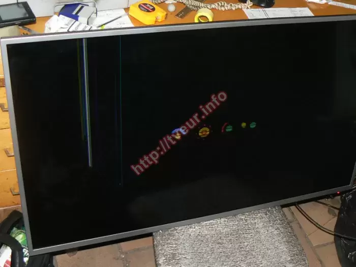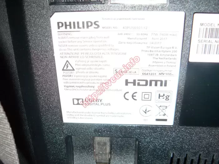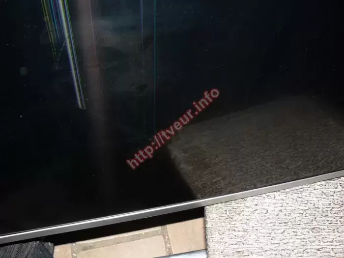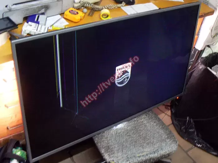 Когда в современном телевизоре из строя выходит ультратонкая, очень хрупкая матрица, ремонт может состоять исключительно в том, что будет выполнена дорогостоящая замена 4К матрицы. Именно с такой проблемой в нашу сервисную мастерскую поступил 43-дюймовый LED телевизор Philips 43PUS6501/12, у которого по неосторожности разбита панель. Этот телевизор, в арсенале которого самые инновационные технологии и функции. Это - Smart TV (Smart-платформа: Android 5.1), Wi-Fi, 4К и др. Модель собрана в 2017 году (Польша), она стала обладателем широкого ассортимента портов и разъемов, в число которых входят три USB, четыре HDMI и многие другие, превращая телевизор в полноценный мультимедийный центр. Осмотрев устройство, телемастером сделано заключение, что замена 4К матрицы неизбежна, поскольку после удара по ней, остался след механического воздействия в виде очень маленького скола (ближе к левой рамке). От него в разные стороны появились достаточно короткие, но при этом глубокие трещины. Вверх от места удара видно несколько длинных цветных вертикальных полос (фото № 1). Также посередине экрана просматривается заставка. Все это говорит о том, что матрица испорчена и восстановлению не подлежит, соответственно требуется ее замена. Такой ремонт может быть выполнен только после того, как будет снята разбитая панель. После удачного демонтажа, выполнены все работы по установке новой панели и ее настройке.