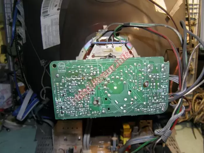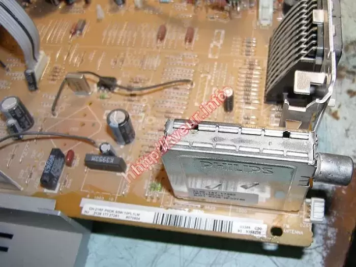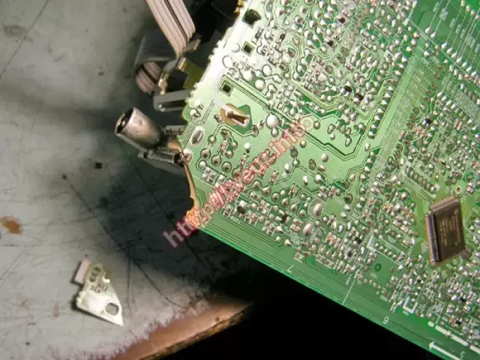 Кинескопный телевизор ранее вскрывался, был удар, после чего отломан кусок платы шасси. Ремонт телевизоров проведен в модуле тюнера и управления. Было произведено восстановление монтажа платы шасси, пропайка тюнера, профилактика.