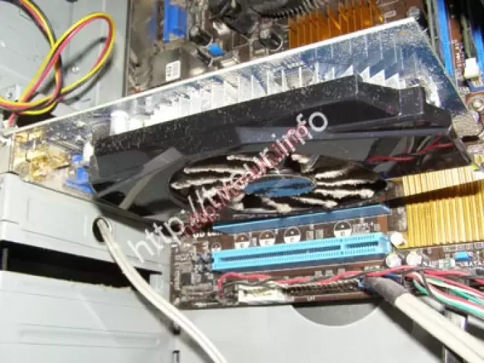 Когда после подключения TV-out, картинка на мониторе пропала, успешный ремонт видеокарты будет заключаться в замене видеочипа. 3. Нарушение цветности, нет одного или нескольких цветов. Отсутствие в разъемах видеокабеля контакта или повреждение непосредственно самого кабеля - первый претендент на данную роль. Дальше отличиться могут видеочип или же элементы обвеса. Если нет одного из цветов (R,G,B), быстрее всего, причина или в дросселях или в согласующих RGB 75-омных резисторах. Когда с ними все в порядке, значит, поломка соответствующего канала видеочипа. В данном случае ремонт современных видеокарт состоит в замене, так как дефекты пайки крайне редки. 4. Перегрев. Проблема перегрева а, соответственно, достаточного охлаждения «горячих» элементов является весьма злободневной. Учитывая рост потребляемых мощностей, данная тема будет актуальной достаточно долго. Основная часть поломок, которые связаны с перегревом возникают, как правило, по вине непосредственно самого пользователя. Причина проста и тривиальна. Независимо от того, что многие пользователи знают о системе охлаждения, при этом не все за ней правильно ухаживают. А она, как любая техника, требует профилактического ухода. Первое - это наличие пыли, присутствие которой приводит к нарушению теплообмена, а также повышенному сопротивлению воздухопотока, а соответственно накоплению статики. Второе - замена термоинтерфейса между поверхностью радиатора кулера и видеочипом. По прошествии времени, термопаста теряет теплопроводящие свойства, а это может приводить к плохому отводу тепла с поверхности чипа. Чтобы этого не происходило, рекомендуется не менее одного раза в год менять термопасту. Третье - разгон, для чего точно потребуется более качественное охлаждение. Многие пользователи пренебрегают этим, оставляют штатный кулер, в итоге получается перегрев и повреждение чипа.