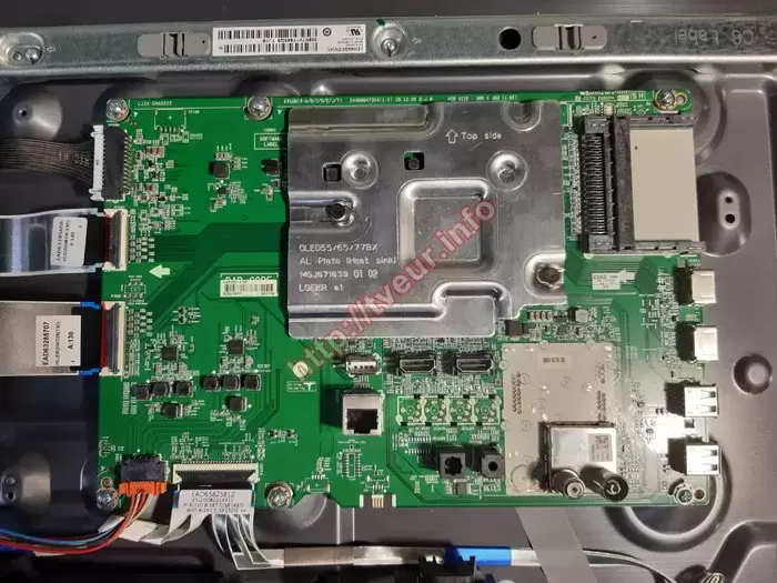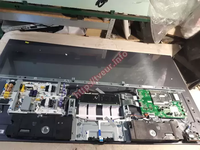 Прежде чем приступить к работе, чтобы стала возможной полноценная диагностика ЖК телевизоров, потребовалось аккуратно разобрать устройство. Для демонтажа задней крышки необходимо было действовать с особой осторожностью, так как модель оснащена сверхтонкой OLED-матрицей, крайне уязвимой к физическому воздействию. В первую очередь телевизор обесточили и разместили экраном вниз на мягкую и ровную поверхность, чтобы исключить риск повреждений. По периметру задней части корпуса были размещены винты разной длины, которые последовательно выкрутили. Затем демонтировали нижнюю декоративную накладку, она не только фиксировала часть крышки, но и закрывала дополнительные крепежные элементы. Крышка удерживается не только на винтах, но и на пластиковых защелках, поэтому для ее съема использовали специальный пластиковый инструмент, аккуратно начиная с нижнего края. Как выяснилось, внутри размещены все ключевые компоненты: справа установлена материнская плата EAX69047304(1.0), слева блок питания, а в нижней части корпуса динамики и шлейфы EAD65825812, EAD63285706 и EAD63285707. После того как была проведена диагностика, стало ясно, что неполадка довольно серьезная, так как вышла из строя материнская плата. В такой ситуации необходим комплексный и затратный ремонт, включая перепрошивку устройства. Заказчику сообщили о характере и цене работ, и он дал согласие на проведение ремонта.